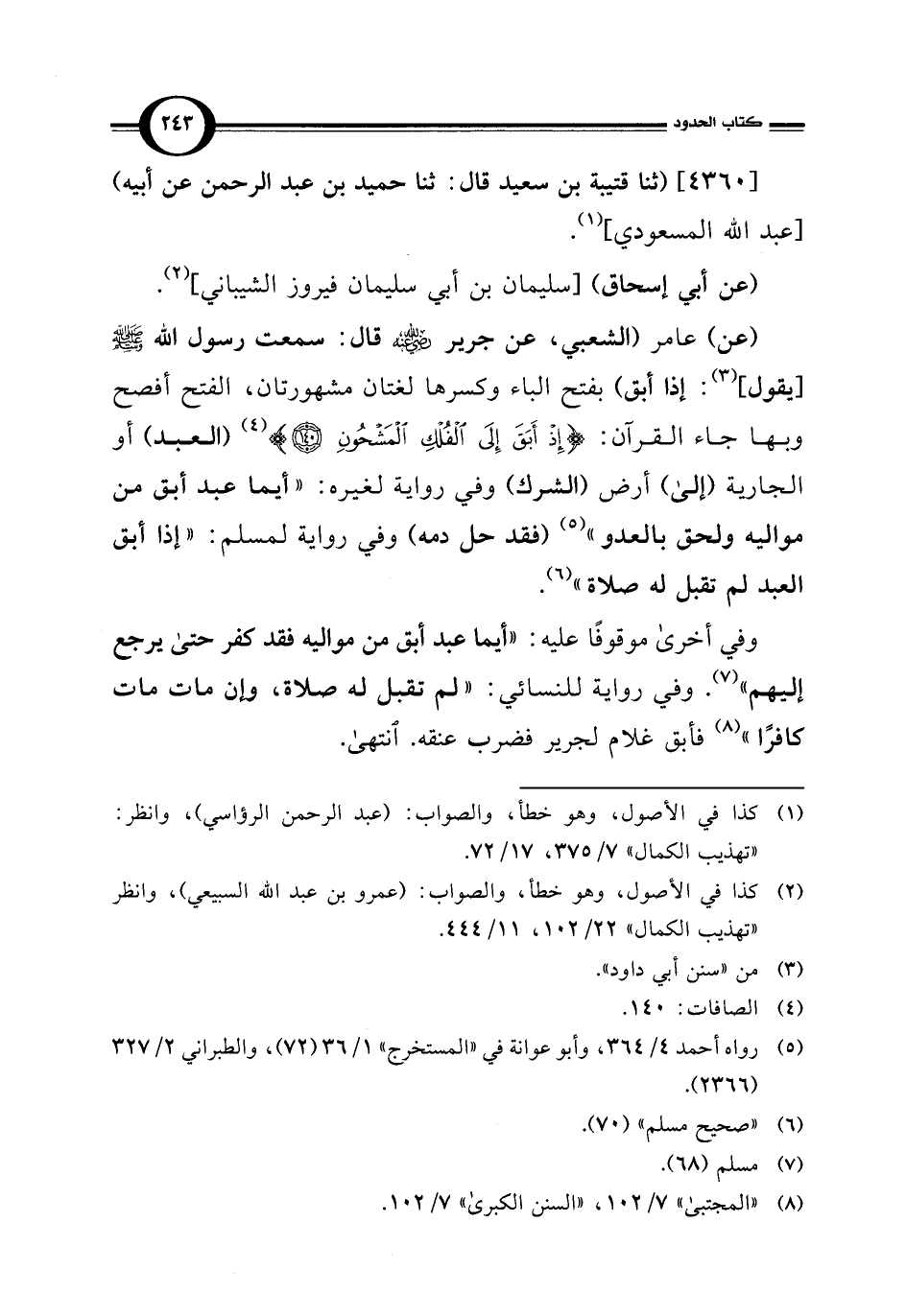 وفي أخرى موقوفًا عليه: "أيما عبد أبق من مواليه فقد كفر حتى يرجع إليهم" (¬7). وفي رواية للنسائي: "لم تقبل له صلاة، وإن مات مات كافرًا" (¬8) فأبق غلام لجرير فضرب عنقه. انتهى.