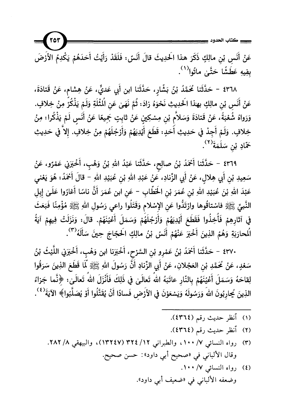 4369 - حَدَّثَنا أَحْمَدُ بْن صالِحٍ، حَدَّثَنا عَبْدُ اللَّهِ بْنُ وَهْبٍ، أَخْبَرَني عَمْرٌو، عَنْ سَعِيدِ بْنِ أَبي هِلالٍ، عَنْ أَبي الزِّنادِ، عَنْ عَبْدِ اللَّهِ بْنِ عُبَيْدِ اللَّهِ -قالَ أَحْمَدُ: هُوَ يَعْني عَبْدَ اللَّهِ بْنَ عُبَيْدِ اللَّهِ بْنِ عُمَرَ بْنِ الخَطّابِ- عَنِ ابن عُمَرَ أَنَّ ناسًا أَغارُوا عَلَى إِبِلِ النَّبيِّ -صلى اللَّه عليه وسلم- فاسْتاقُوها وارْتَدُّوا عَنِ الإِسْلامِ وَقَتَلُوا راعي رَسُولِ اللَّهِ -صلى اللَّه عليه وسلم- مُؤْمِنًا فَبَعَثَ في آثارِهِمْ فَأُخِذُوا فَقَطَعَ أَيْدِيَهُمْ وَأَرْجُلَهُمْ وَسَمَلَ أَعْيُنَهُمْ. قالَ: وَنَزَلَتْ فِيهِمْ آيَةُ المُحارَبَةِ وَهُمُ الذِينَ أَخْبَرَ عَنْهُمْ أَنَسُ بْن مالِكٍ الحَجّاجَ حِينَ سَأَلَهُ (¬3).