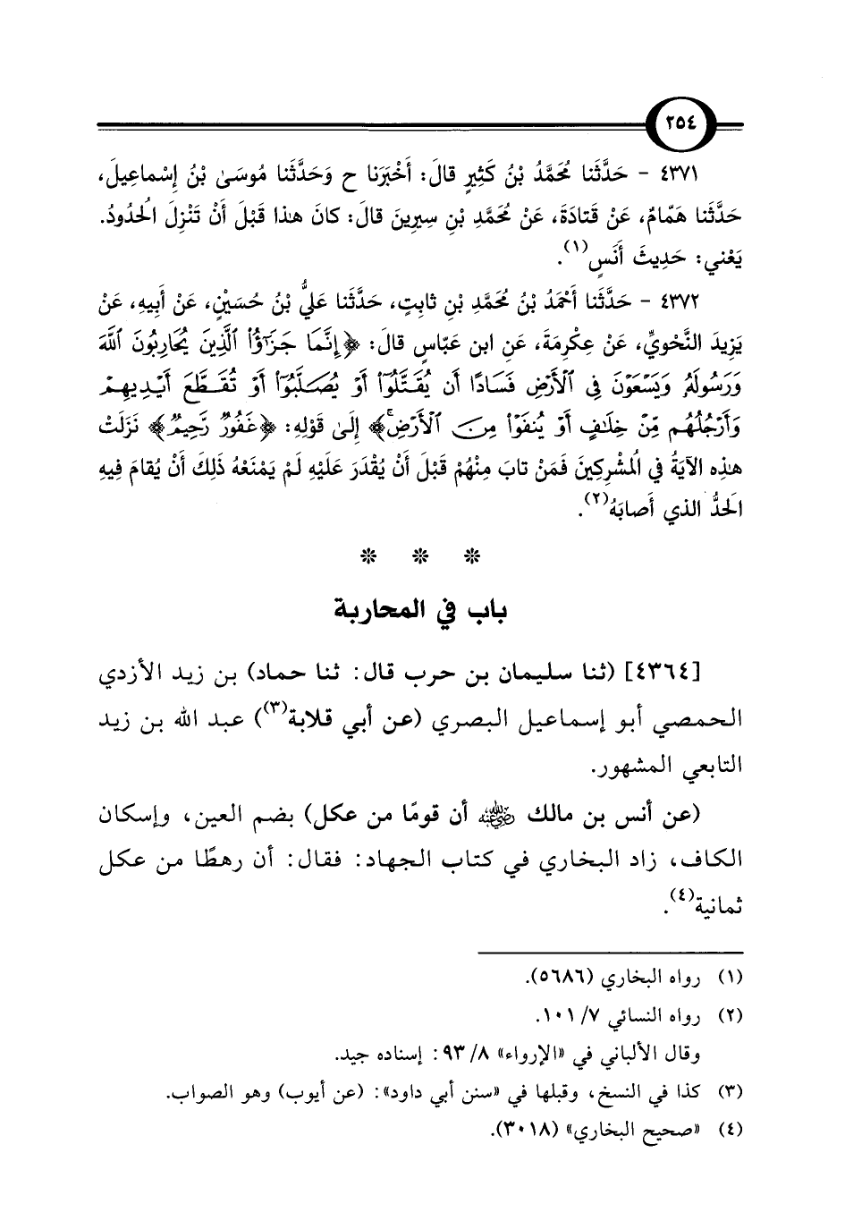 [4364] (ثنا سليمان بن حرب قال: ثنا حماد) بن زيد الأزدي الحمصي أبو إسماعيل البصري (عن أبي قلابة) (¬3) عبد اللَّه بن زيد التابعي المشهور.
