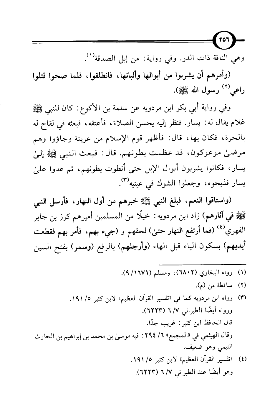 وفي رواية أبي بكر ابن مردويه عن سلمة بن الأكوع: كان للنبي -صلى اللَّه عليه وسلم- غلام يقال له: يسار. فنظر إليه يحسن الصلاة، فأعتقه، فبعثه في لقاح له بالحرة، فكان بها، قال: فأظهر قوم الإسلام من عرينة وجاؤوا وهم مرضى موعوكون، قد عظمت بطونهم. قال: فبعث النبي -صلى اللَّه عليه وسلم- إلى يسار، فكانوا يشربون أبوال الإبل حتى أنطوت بطونهم، ثم عدوا على يسار فذبحوه، وجعلوا الشوك في عينيه (¬3).