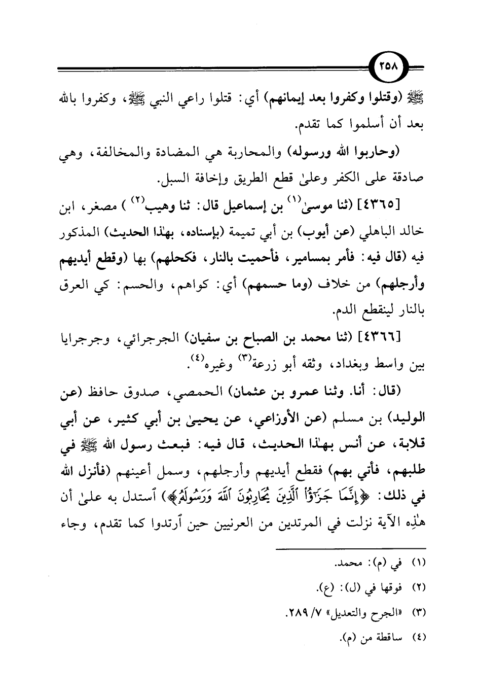 [4365] ثنا موسى (¬1) بن إسماعيل قال: ثنا وهيب) (¬2) مصغر، ابن خالد الباهلي (عن أيوب) بن أبي تميمة (بإسناده، بهذا الحديث) المذكور فيه (قال فيه: فأمر بمسامير، فأحميت بالنار، فكحلهم) بها (وقطع أيديهم وأرجلهم) من خلاف (وما حسمهم) أي: كواهم، والحسم: كي العرق بالنار لينقطع الدم.