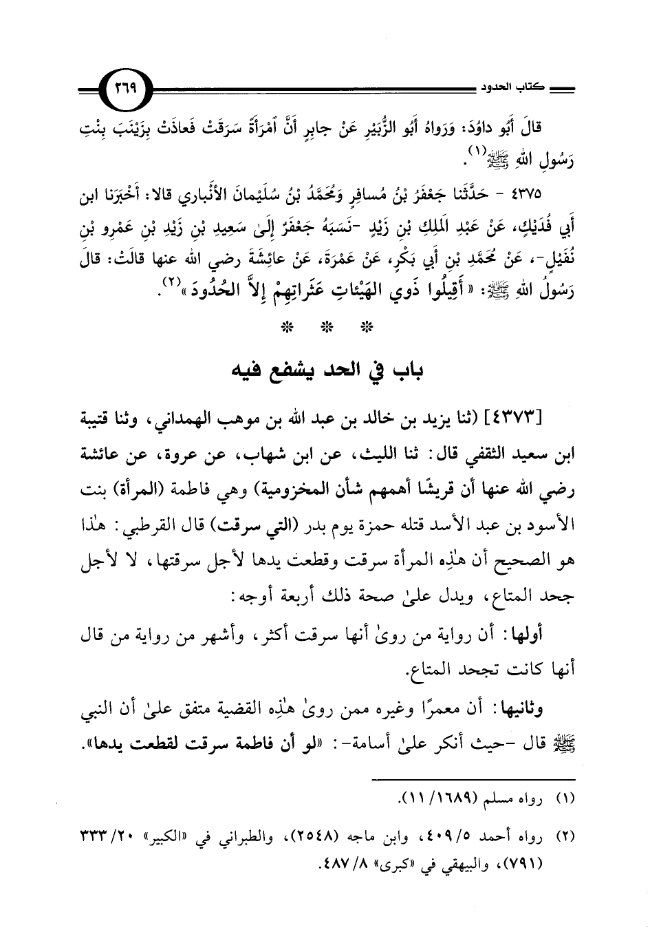 [4373] (ثنا يزيد بن خالد بن عبد اللَّه بن موهب الهمداني، وثنا قتيبة ابن سعيد الثقفي قال: ثنا الليث، عن ابن شهاب، عن عروة، عن عائشة رضي اللَّه عنها أن قريشا أهمهم شأن المخزومية) وهي فاطمة (المرأة) بنت الأسود بن عبد الأسد قتله حمزة يوم بدر (التي سرقت) قال القرطبي: هذا هو الصحيح أن هذِه المرأة سرقت وقطعت يدها لأجل سرقتها، لا لأجل جحد المتاع، ويدل على صحة ذلك أربعة أوجه: