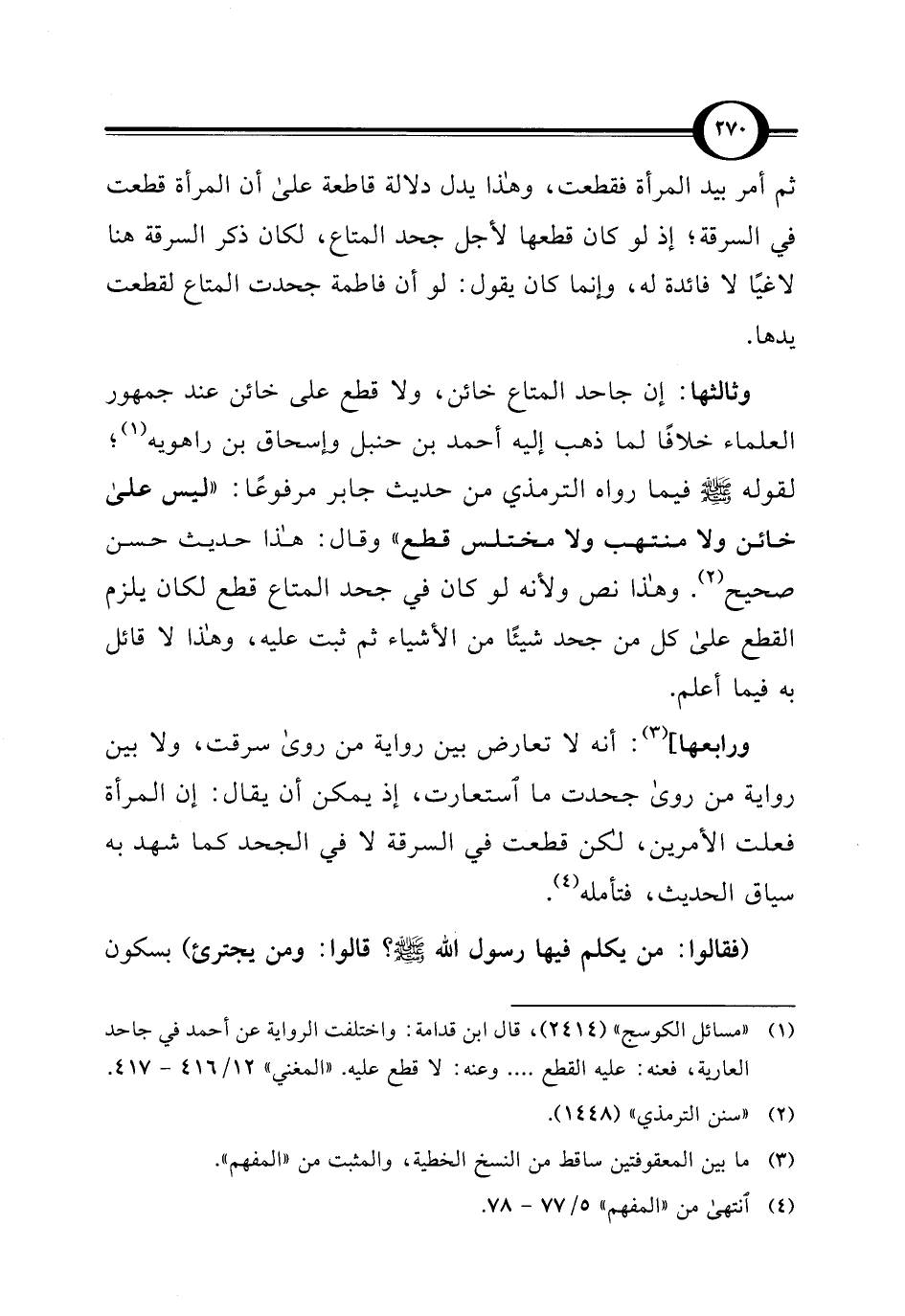 ثم أمر بيد المرأة فقطعت، وهذا يدل دلالة قاطعة على أن المرأة قطعت في السرقة؛ إذ لو كان قطعها لأجل جحد المتاع، لكان ذكر السرقة هنا لاغيًا لا فائدة له، وإنما كان يقول: لو أن فاطمة جحدت المتاع لقطعت يدها.