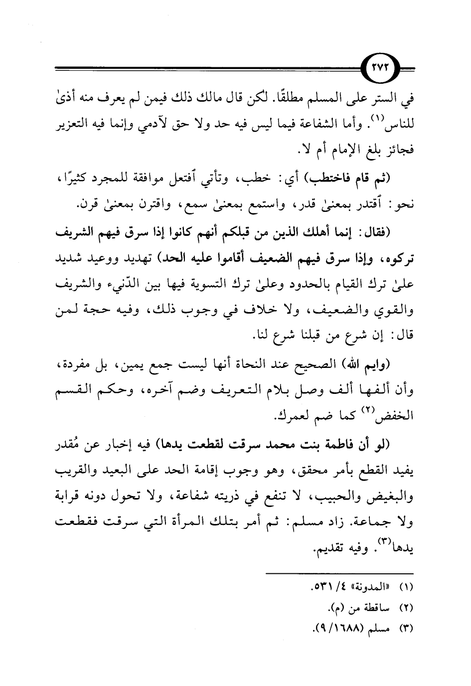 (لو أن فاطمة بنت محمد سرقت لقطعت يدها) فيه إخبار عن مُقدر يفيد القطع بأمر محقق، وهو وجوب إقامة الحد على البعيد والقريب والبغيض والحبيب، لا تنفع في ذريته شفاعة، ولا تحول دونه قرابة ولا جماعة. زاد مسلم: ثم أمر بتلك المرأة التي سرقت فقطعت يدها (¬3). وفيه تقديم.