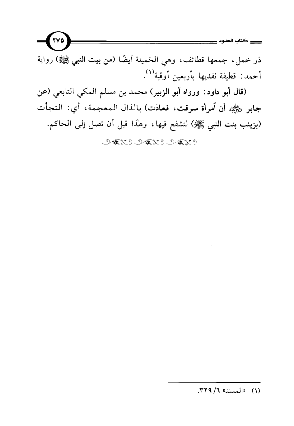(قال أبو داود: ورواه أبو الزبير) محمد بن مسلم المكي التابعي (عن جابر -رضي اللَّه عنه- أن امرأة سرقت، فعاذت) بالذال المعجمة، أي: التجأت (بزينب بنت النبي -صلى اللَّه عليه وسلم-) لتشفع فيها، وهذا قبل أن تصل إلى الحاكم.