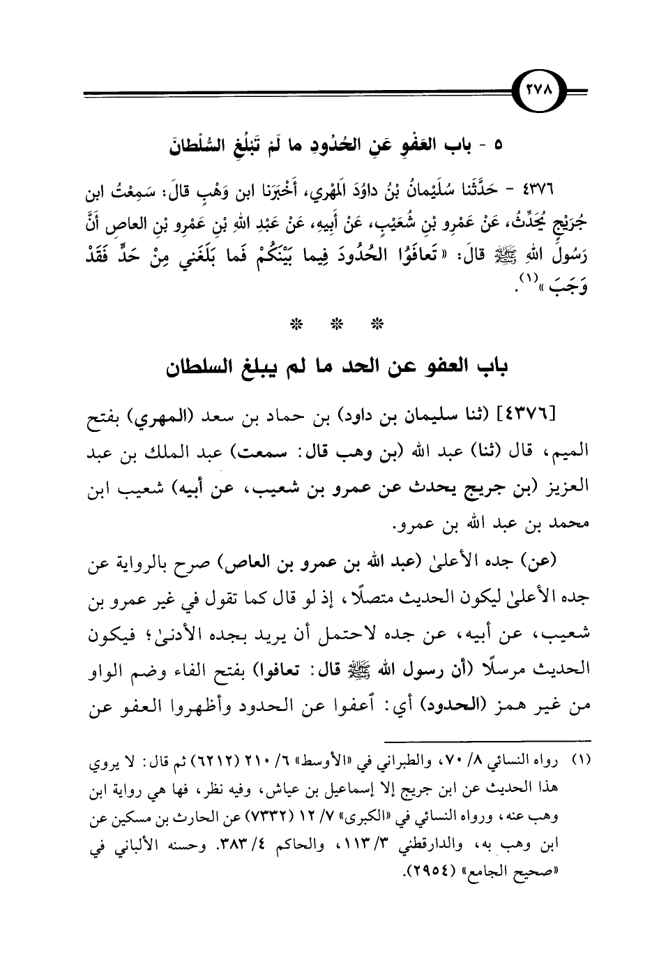 [4376] (ثنا سليمان بن داود) بن حماد بن سعد (المهري) بفتح الميم، قال (ثنا) عبد اللَّه (بن وهب قال: سمعت) عبد الملك بن عبد العزيز (بن جريج يحدث عن عمرو بن شعيب، عن أبيه) شعيب ابن محمد بن عبد اللَّه بن عمرو.