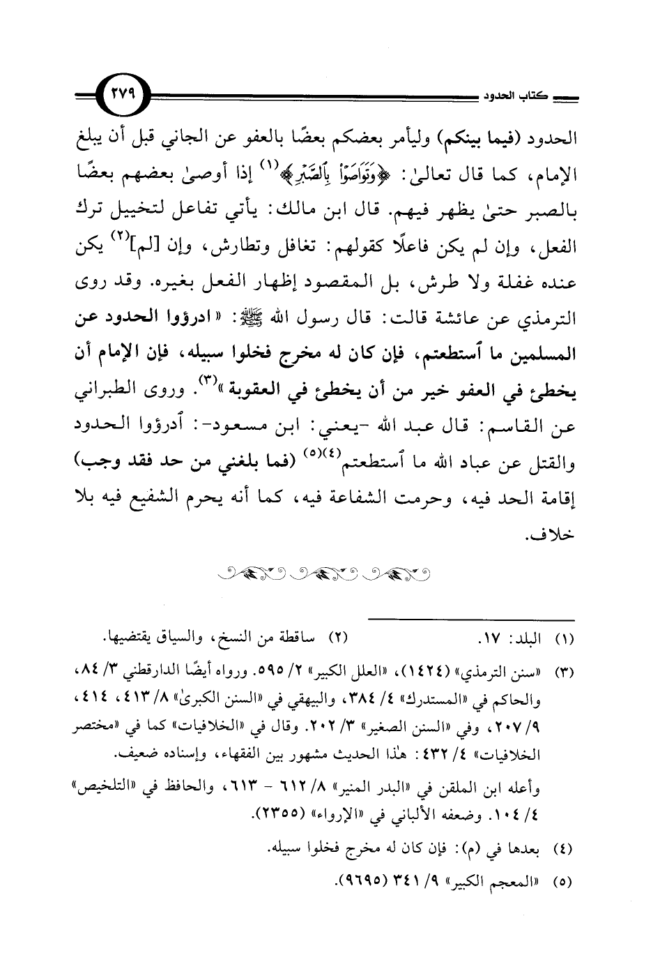 الحدود (فيما بينكم) وليأمر بعضكم بعضًا بالعفو عن الجاني قبل أن يبلغ الإمام، كما قال تعالى: {وَتَوَاصَوْا بِالصَّبْرِ} (¬1) إذا أوصى بعضهم بعضًا بالصبر حتى يظهر فيهم. قال ابن مالك: يأتي تفاعل لتخييل ترك الفعل، وإن لم يكن فاعلًا كقولهم: تغافل وتطارش، وإن [لم] (¬2) يكن عنده غفلة ولا طرش، بل المقصود إظهار الفعل بغيره. وقد روى الترمذي عن عائشة قالت: قال رسول اللَّه -صلى اللَّه عليه وسلم-: "ادرؤوا الحدود عن المسلمين ما استطعتم، فإن كان له مخرج فخلوا سبيله، فإن الإمام أن يخطئ في العفو خير من أن يخطئ في العقوبة" (¬3). وروى الطبراني عن القاسم: قال عبد اللَّه -يعني: ابن مسعود-: ادرؤوا الحدود والقتل عن عباد اللَّه ما استطعتم (¬4) (¬5) (فما بلغني من حد فقد وجب) إقامة الحد فيه، وحرمت الشفاعة فيه، كما أنه يحرم الشفيع فيه بلا خلاف.