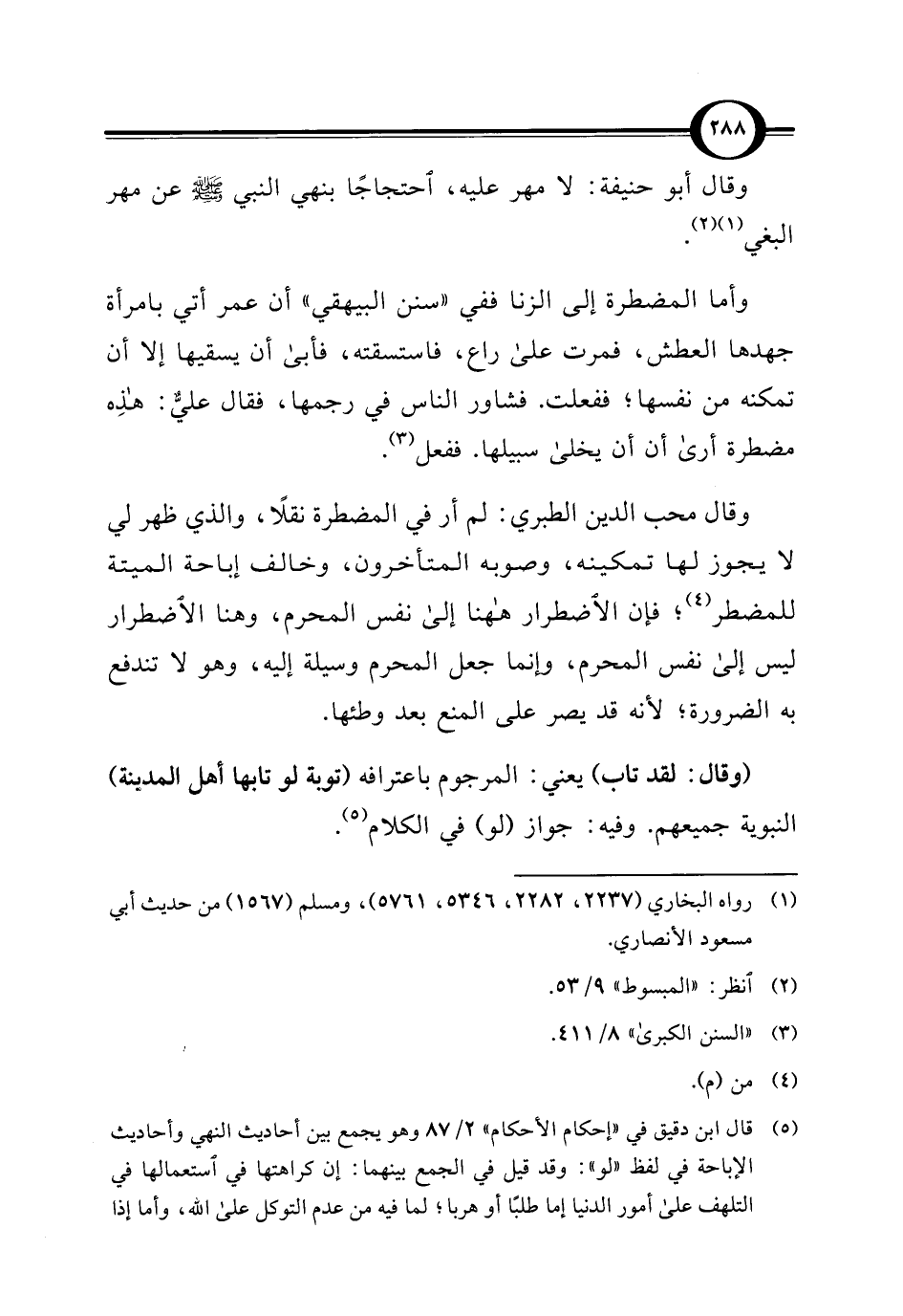 وأما المضطرة إلى الزنا ففي "سنن البيهقي" أن عمر أتي بامرأة جهدها العطش، فمرت على راع، فاستسقته، فأبى أن يسقيها إلا أن تمكنه من نفسها؛ ففعلت. فشاور الناس في رجمها، فقال عليٌّ: هذِه مضطرة أرى أن يخلى سبيلها. ففعل (¬3).