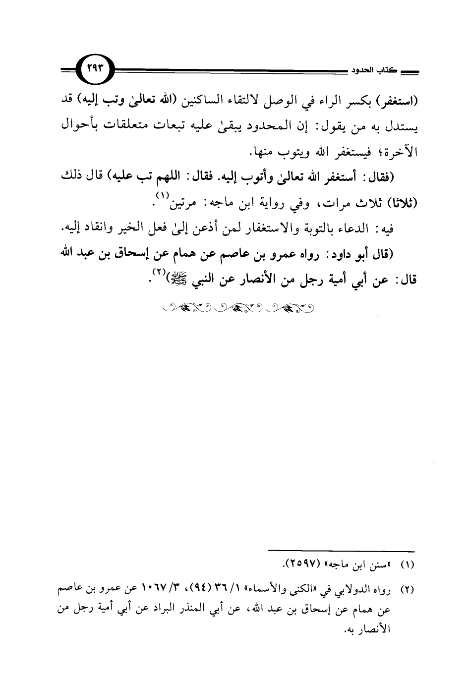 (استغفر) بكسر الراء في الوصل لالتقاء الساكنين (اللَّه تعالى وتب إليه) قد يستدل به من يقول: إن المحدود يبقى عليه تبعات متعلقات بأحوال الآخرة؛ فيستغفر اللَّه ويتوب منها.