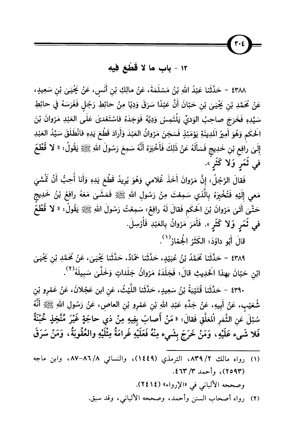 4388 - حَدَّثَنا عَبْدُ اللَّهِ بْن مَسْلَمَةَ، عَنْ مالِكِ بْنِ أَنَسٍ، عَنْ يَحْيَى بْنِ سَعِيدٍ، عَنْ مُحَمَّدِ بْنِ يَحْيَى بْنِ حَبّانَ أَنَّ عَبْدًا سَرَقَ وَدِيّا مِنْ حائِطِ رَجُلٍ فَغَرَسَة في حائِطِ سَيِّدِهِ فَخَرَجَ صاحِبُ الوَديِّ يَلْتَمِسُ وَدِيَّه فَوَجَدَهُ فاسْتَعْدى عَلَى العَبْدِ مَرْوانَ بْنَ الحَكَمِ وَهُوَ أَمِيرُ المَدِينَةِ يَوْمَئِذٍ فَسَجَنَ مَرْوان العَبْدَ وَأَرادَ قَطْعَ يَدِهِ فانْطَلَقَ سَيِّدُ العَبْدِ إِلَى رافِعِ بْنِ خَدِيجٍ فَسَأَلَهُ عَنْ ذَلِكَ فَأَخْبَرَهُ أَنَّهُ سَمِعَ رَسُولَ اللَّهِ -صلى اللَّه عليه وسلم- يَقُولُ: "لا قَطْعَ في ثَمَرٍ وَلا كَثَرٍ".