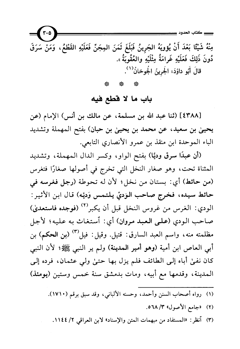 [4388] (ثنا عبد اللَّه بن مسلمة، عن مالك بن أنس) الإمام (عن يحيى بن سعيد، عن محمد بن يحيى بن حبان) بفتح المهملة وتشديد الباء الموحدة ابن منقذ بن عمرو الأنصاري التابعي.