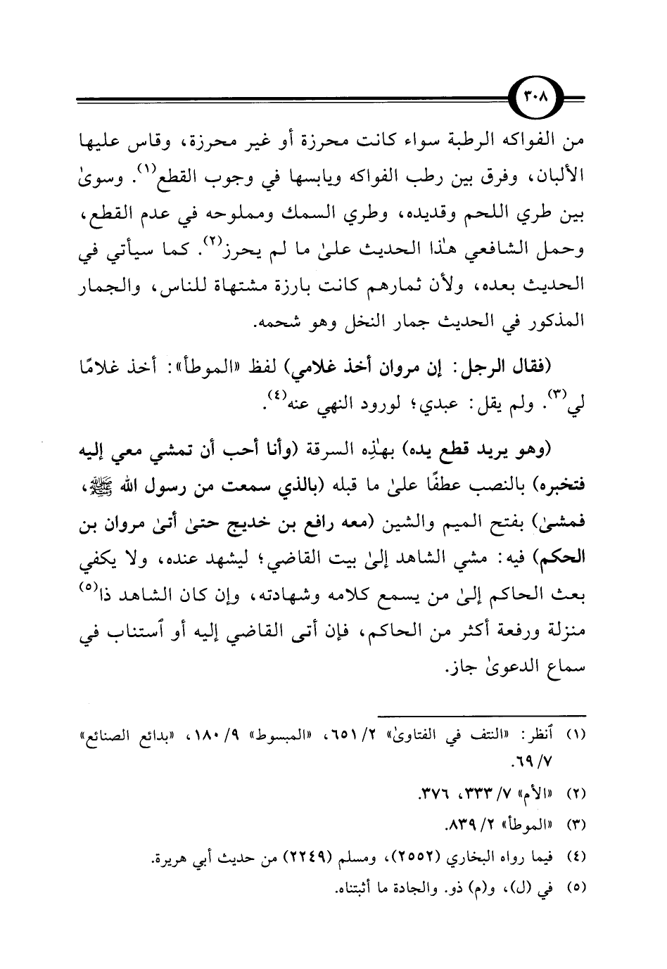 (وهو يريد قطع يده) بهذِه السرقة (وأنا أحب أن تمشي معي إليه فتخبره) بالنصب عطفًا على ما قبله (بالذي سمعت من رسول اللَّه -صلى اللَّه عليه وسلم-، فمشى) بفتح الميم والشين (معه رافع بن خديج حتى أتى مروان بن الحكم) فيه: مشي الشاهد إلى بيت القاضي؛ ليشهد عنده، ولا يكفي بعث الحاكم إلى من يسمع كلامه وشهادته، وإن كان الشاهد ذا (¬5) منزلة ورفعة أكثر من الحاكم، فإن أتى القاضي إليه أو استناب في سماع الدعوى جاز.