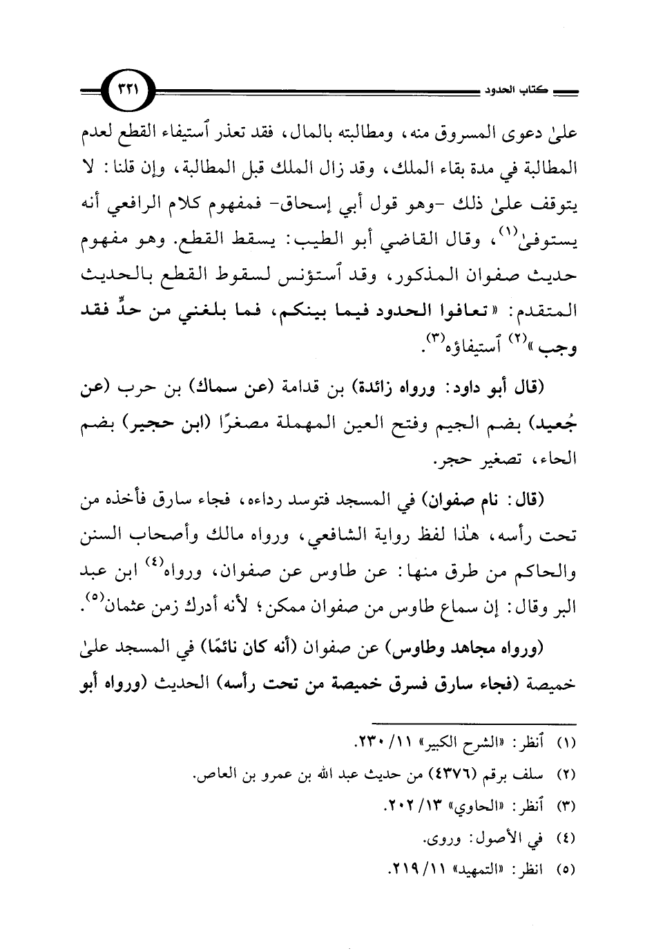 (قال: نام صفوان) في المسجد فتوسد رداءه، فجاء سارق فأخذه من تحت رأسه، هذا لفظ رواية الشافعي، ورواه مالك وأصحاب السنن والحاكم من طرق منها: عن طاوس عن صفوان، ورواه (¬4) ابن عبد البر وقال: إن سماع طاوس من صفوان ممكن؛ لأنه أدرك زمن عثمان (¬5).