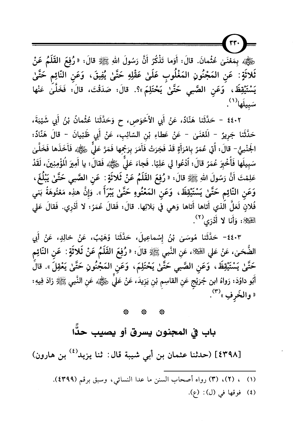 4402 - حَدَّثَنا هَنّادٌ، عَنْ أَبي الأَحْوَصِ، ح وَحَدَّثَنا عُثْمان بْن أَبي شَيْبَةَ، حَدَّثَنا جَرِيرٌ -المَعْنَى- عَنْ عَطَاءِ بْنِ السّائِبِ، عَنْ أَبي ظَبْيانَ -قالَ هَنّادٌ: الجَنْبيُّ- قالَ: أُتي عُمَرُ بِامْرَأَةٍ قَدْ فَجَرَتْ فَأَمَرَ بِرَجْمِها فَمَرَّ عَليٌّ -رضي اللَّه عنه- فَأَخَذَها فَخَلَّى سَبِيلَها فَأُخْبِرَ عُمَرُ قالَ: ادْعُوا لي عَلِيّا. فَجاءَ عَليٌّ -رضي اللَّه عنه- فَقالَ: يا أَمِيرَ المُؤْمِنِينَ، لَقَدْ عَلِمْتَ أَنَّ رَسُولَ اللَّهِ -صلى اللَّه عليه وسلم- قالَ: "رُفِعَ القَلَمُ عَنْ ثَلاثَةٍ: عَنِ الصَّبي حَتَّى يَبْلُغَ، وَعَنِ النّائِمِ حَتَّى يَسْتَيْقِظَ، وَعَنِ المَعْتُوهِ حَتَّى يَبْرَأَ". وَإِنَّ هذِه مَعْتُوهَةُ بَني فلانٍ لَعَلَّ الذي أَتاها أَتاها وَهي في بَلائِها. قالَ: فَقالَ عُمَرُ: لا أَدْرِي. فَقالَ عَلي -عليه السلام-: وَأَنا لا أَدْرَي (¬2).