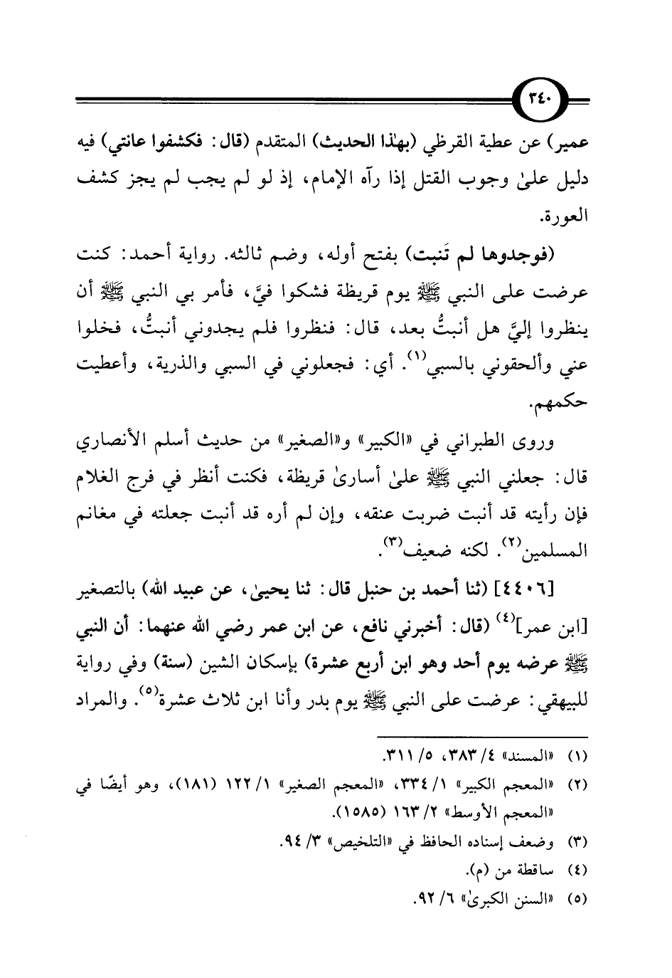وروى الطبراني في "الكبير" و"الصغير" من حديث أسلم الأنصاري قال: جعلني النبي -صلى اللَّه عليه وسلم- على أسارى قريظة، فكنت انظر في فرج الغلام فإن رأيته قد أنبت ضربت عنقه، وإن لم أره قد أنبت جعلته في مغانم المسلمين (¬2). لكنه ضعيف (¬3).