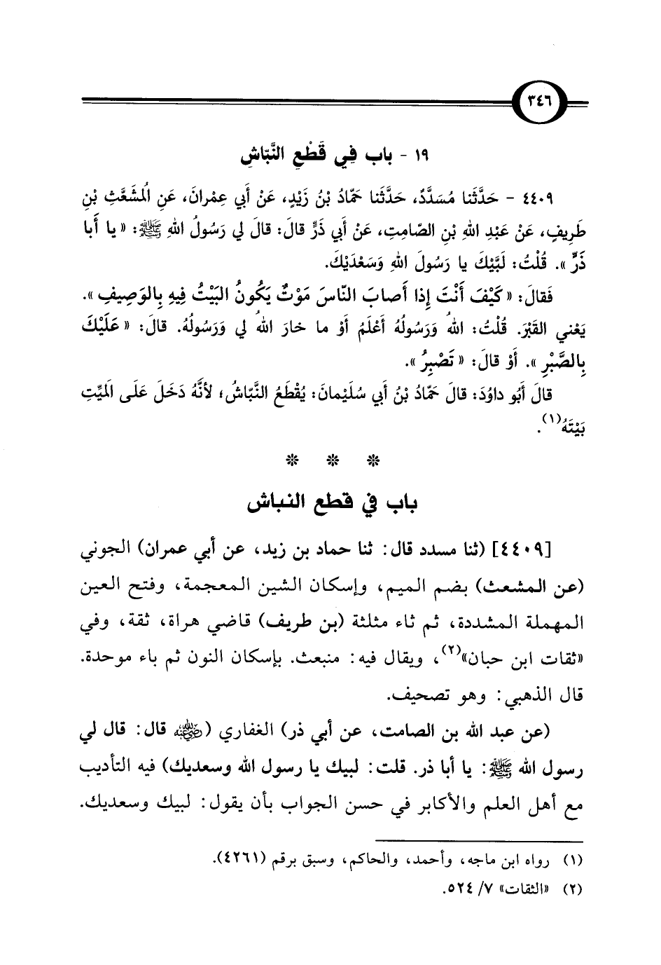 [4409] (ثنا مسدد قال: ثنا حماد بن زيد، عن أبي عمران) الجوني (عن المشعث) بضم الميم، وإسكان الشين المعجمة، وفتح العين المهملة المشددة، ثم ثاء مثلثة (بن طريف) قاضي هراة، ثقة، وفي "ثقات ابن حبان" (¬2)، ويقال فيه: منبعث. بإسكان النون ثم باء موحدة. قال الذهبي: وهو تصحيف.