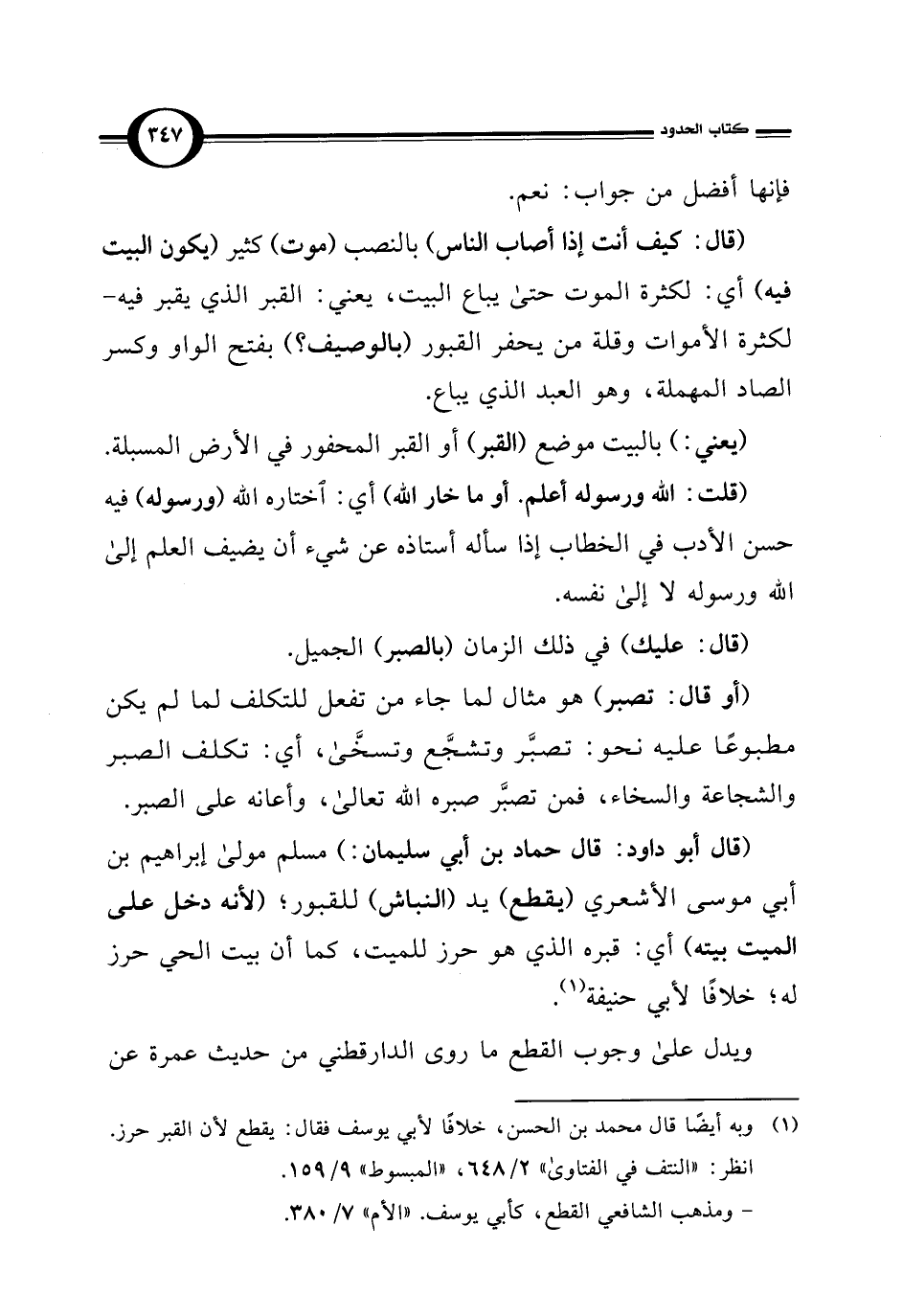 (قال أبو داود: قال حماد بن أبي سليمان: ) مسلم مولى إبراهيم بن أبي موسى الأشعري (يقطع) يد (النباش) للقبور؛ (لأنه دخل على الميت بيته) أي: قبره الذي هو حرز للميت، كما أن بيت الحي حرز له؛ خلافًا لأبي حنيفة (¬1).