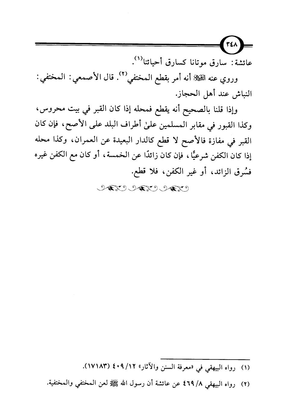 وروي عنه عليه السلام أنه أمر بقطع المختفي (¬2). قال الأصمعي: المختفي: النباش عند أهل الحجاز.