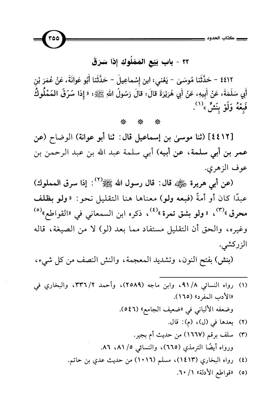 (عن أبي هريرة -رضي اللَّه عنه- قال: قال رسول اللَّه -صلى اللَّه عليه وسلم- (¬2): إذا سرق المملوك) عبدًا كان أو أمةً (فبعه ولو) معناها هنا التقليل نحو: "ولو بظلف محرق" (¬3)، "ولو بشق تمرة" (¬4)، ذكره ابن السمعاني في "القواطع" (¬5) وغيره، والحق أن التقليل مستفاد مما بعد (لو) لا من الصيغة، قاله الزركشي.