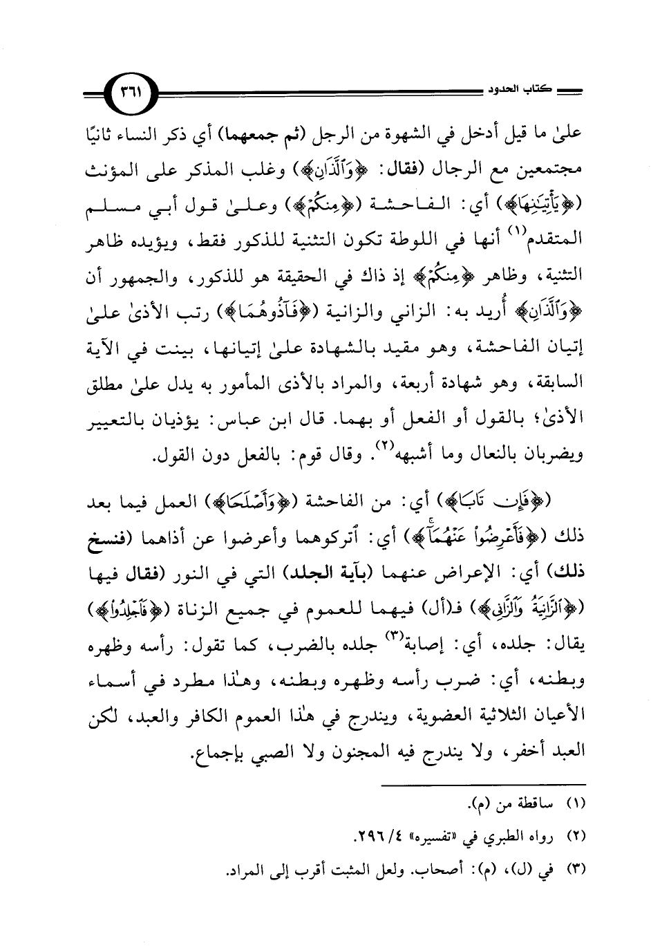 ({فَإِنْ تَابَا}) أي: من الفاحشة ({وَأَصْلَحَا}) العمل فيما بعد ذلك ({فَأَعْرِضُوا عَنْهُمَا}) أي: اتركوهما وأعرضوا عن أذاهما (فنسخ ذلك) أي: الإعراض عنهما (بآية الجلد) التي في النور (فقال فيها ({الزَّانِيَةُ وَالزَّانِي}) فـ (أل) فيهما للعموم في جميع الزناة ({فَاجْلِدُوا}) يقال: جلده، أي: إصابة (¬3) جلده بالضرب، كما تقول: رأسه وظهره وبطنه، أي: ضرب رأسه وظهره وبطنه، وهذا مطرد في أسماء الأعيان الثلاثية العضوية، ويندرج في هذا العموم الكافر والعبد، لكن العبد أخفر، ولا يندرج فيه المجنون ولا الصبي بإجماع.