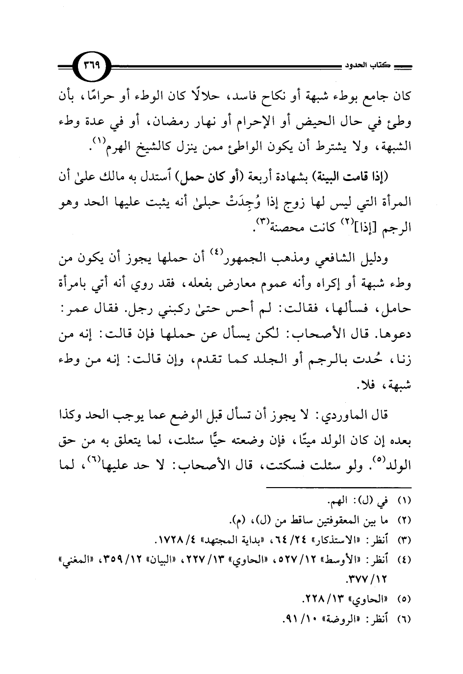 ودليل الشافعي ومذهب الجمهور (¬4) أن حملها يجوز أن يكون من وطء شبهة أو إكراه وأنه عموم معارض بفعله، فقد روي أنه أتي بامرأة حامل، فسألها، فقالت: لم أحس حتى ركبني رجل. فقال عمر: دعوها. قال الأصحاب: لكن يسأل عن حملها فإن قالت: إنه من زنا، حُدت بالرجم أو الجلد كما تقدم، وإن قالت: إنه من وطء شبهة، فلا.