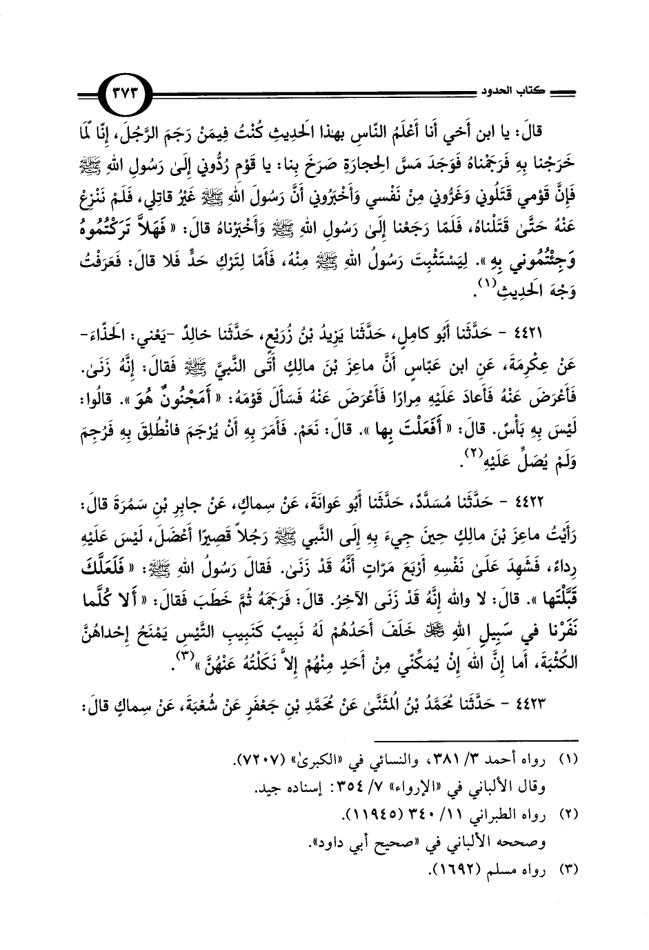4422 - حَدَّثَنا مُسَدَّدٌ، حَدَّثَنا أَبُو عَوانَةَ، عَنْ سِماكٍ، عَنْ جابِرِ بْنِ سَمُرَةَ قالَ: رَأَيْتُ ماعِزَ بْنَ مالِكٍ حِينَ جِيءَ بِهِ إِلَى النَّبي -صلى اللَّه عليه وسلم- رَجُلًا قَصِيرًا أَعْضَلَ، لَيْسَ عَلَيْهِ رِداءٌ، فَشَهِدَ عَلَى نَفْسِهِ أَرْبَعَ مَرّاتٍ أَنَّهُ قَدْ زَنَى. فَقالَ رَسُول اللَّهِ -صلى اللَّه عليه وسلم-: "فَلَعَلَّكَ قَبَّلْتَها". قالَ: لا واللَّه إِنَّهُ قَدْ زَنَى الآخِرُ. قالَ: فَرَجَمَهُ ثُمَّ خَطَبَ فَقالَ: "أَلا كُلَّما نَفَرْنا في سَبِيلِ اللَّهِ عَزَّ وَجَلَّ خَلَفَ أَحَدُهُمْ لَهُ نَبِيبٌ كَنَبِيبِ التَّيْسِ يَمْنَحُ إِحْداهُنَّ الكُثْبَةَ، أَما إِنَّ اللَّهَ إِنْ يُمَكِّنّي مِنْ أَحَدٍ مِنْهُمْ إِلا نَكَلْتُهُ عَنْهُنَّ" (¬3).