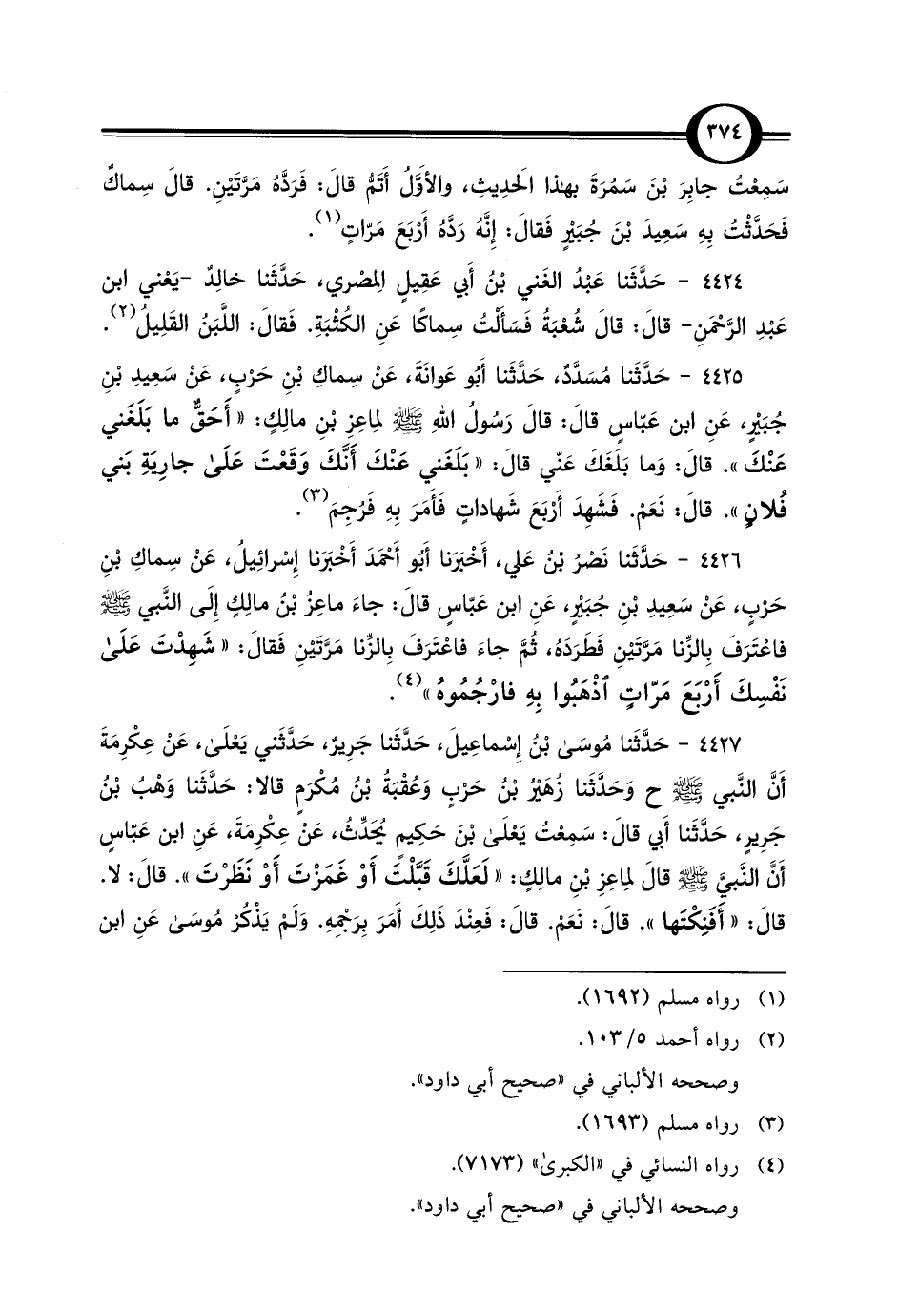4425 - حَدَّثَنا مُسَدَّدٌ، حَدَّثَنا أَبُو عَوانَةَ، عَنْ سِماكِ بْنِ حَرْبٍ، عَنْ سَعِيدِ بْنِ جُبَيْرٍ، عَنِ ابن عَبّاسٍ قالَ: قالَ رَسُولُ اللَّهِ -صلى اللَّه عليه وسلم- لِماعِزِ بْنِ مالِكٍ: "أَحَقٌّ ما بَلَغَني عَنْكَ". قالَ: وَما بَلَغَكَ عَنّي قالَ: "بَلَغَني عَنْكَ أَنَّكَ وَقَعْتَ عَلَى جارِيَةِ بَني فُلانٍ". قالَ: نَعَمْ. فَشَهِدَ أَرْبَعَ شَهاداتٍ فَأَمَرَ بِهِ فَرُجِمَ (¬3).