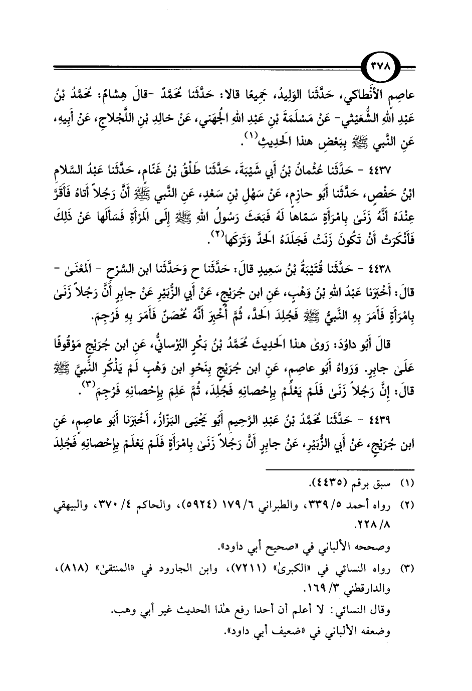 4438 - حَدَّثَنا قُتَيْبَةُ بْنُ سَعِيدٍ قالَ: حَدَّثَنا ح وَحَدَّثَنا ابن السَّرْحِ -المَعْنَى- قالَ: أَخْبَرَنا عَبْدُ اللَّهِ بْن وَهْبٍ، عَنِ ابن جُرَيْجٍ، عَنْ أَبي الزُّبَيرِ عَنْ جابِرٍ أَنَّ رَجُلًا زَنَى بِامْرَأَةٍ فَأَمَرَ بِهِ النَّبيُّ -صلى اللَّه عليه وسلم- فجُلِدَ الحَدَّ، ثُمَّ أُخْبِرَ أَنَّهُ مُحْصَنٌ فَأَمَرَ بِهِ فَرُجِمَ.