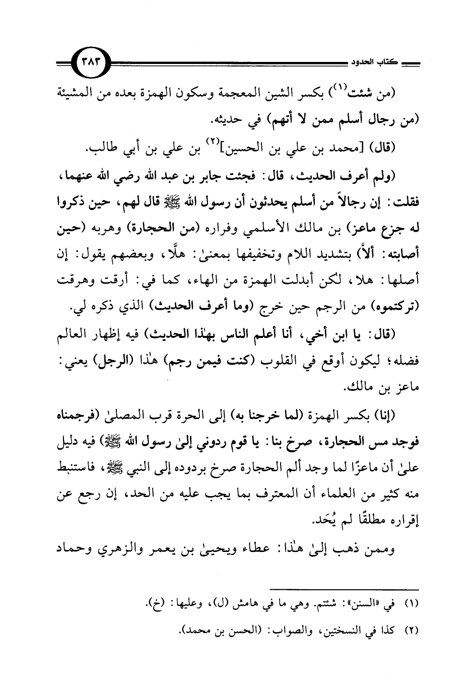 (ولم أعرف الحديث، قال: فجئت جابر بن عبد اللَّه رضي اللَّه عنهما، فقلت: إن رجالًا من أسلم يحدثون أن رسول اللَّه -صلى اللَّه عليه وسلم- قال لهم، حين ذكروا له جزع ماعز) بن مالك الأسلمي وفراره (من الحجارة) وهربه (حين أصابته: ألَّا) بتشديد اللام وتخفيفها بمعنى: هلَّا، وبعضهم يقول: إن أصلها: هلا، لكن أبدلت الهمزة من الهاء، كما في: أرقت وهرقت (تركتموه) من الرجم حين خرج (وما أعرف الحديث) الذي ذكره لي.