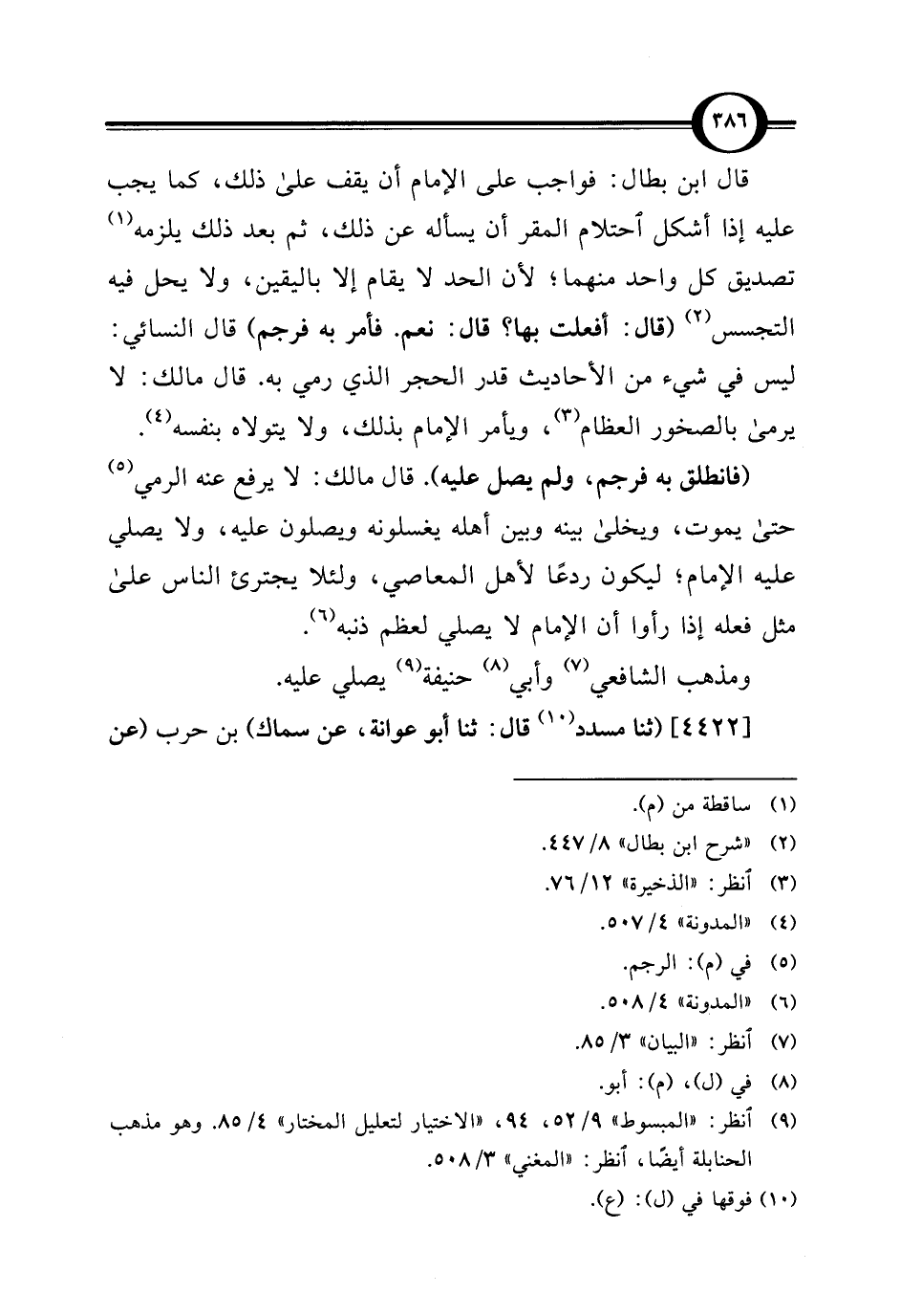 قال ابن بطال: فواجب على الإمام أن يقف على ذلك، كما يجب عليه إذا أشكل احتلام المقر أن يسأله عن ذلك، ثم بعد ذلك يلزمه (¬1) تصديق كل واحد منهما؛ لأن الحد لا يقام إلا باليقين، ولا يحل فيه التجسس (¬2) (قال: أفعلت بها؟ قال: نعم. فأمر به فرجم) قال النسائي: ليس في شيء من الأحاديث قدر الحجر الذي رمي به. قال مالك: لا يرمى بالصخور العظام (¬3)، ويأمر الإمام بذلك، ولا يتولاه بنفسه (¬4).