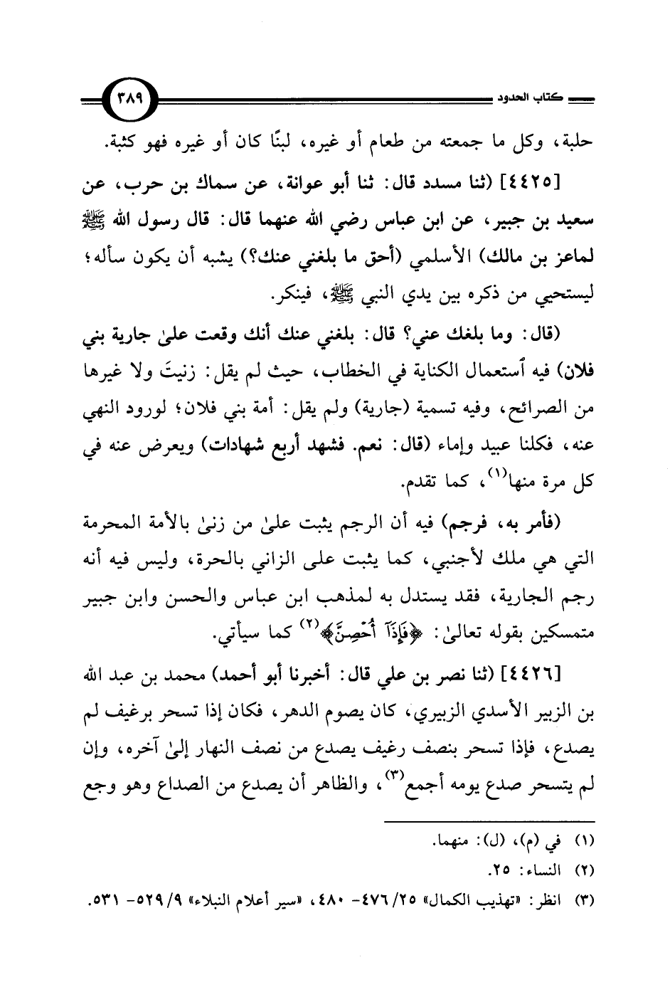 [4425] (ثنا مسدد قال: ثنا أبو عوانة، عن سماك بن حرب، عن سعيد بن جبير، عن ابن عباس رضي اللَّه عنهما قال: قال رسول اللَّه -صلى اللَّه عليه وسلم- لماعز بن مالك) الأسلمي (أحق ما بلغني عنك؟ ) يشبه أن يكون سأله؛ ليستحيي من ذكره بين يدي النبي -صلى اللَّه عليه وسلم-، فينكر.