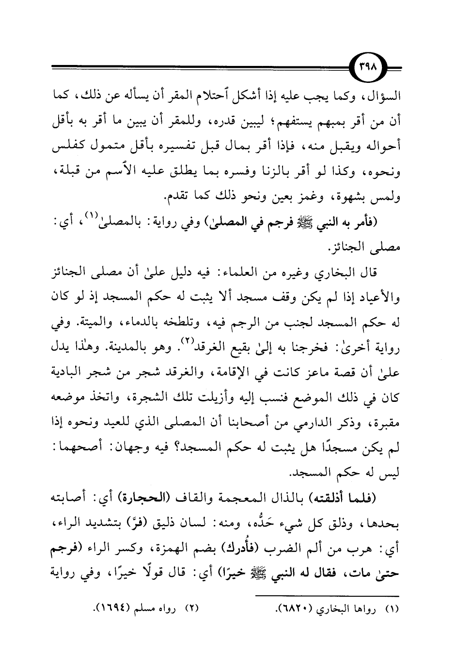 قال البخاري وغيره من العلماء: فيه دليل على أن مصلى الجنائز والأعياد إذا لم يكن وقف مسجد ألا يثبت له حكم المسجد إذ لو كان له حكم المسجد لجنب من الرجم فيه، وتلطخه بالدماء، والميتة. وفي رواية أخرى: فخرجنا به إلى بقيع الغرقد (¬2). وهو بالمدينة. وهذا يدل على أن قصة ماعز كانت في الإقامة، والغرقد شجر من شجر البادية كان في ذلك الموضع فنسب إليه وأزيلت تلك الشجرة، واتخذ موضعه مقبرة، وذكر الدارمي من أصحابنا أن المصلى الذي للعيد ونحوه إذا لم يكن مسجدًا هل يثبت له حكم المسجد؟ فيه وجهان: أصحهما: ليس له حكم المسجد.