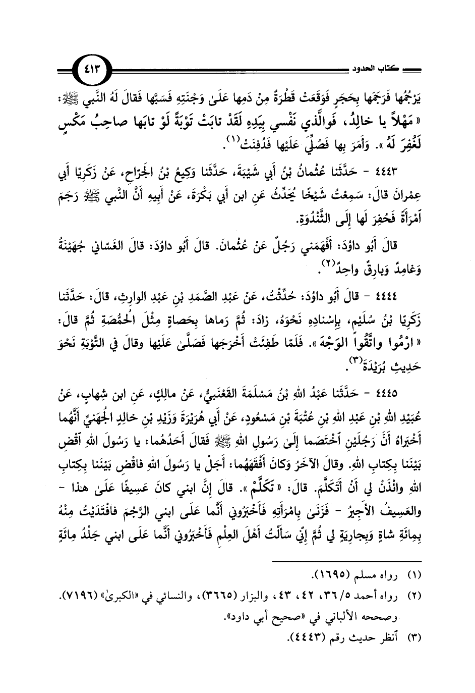 4445 - حَدَّثَنا عَبْدُ اللَّهِ بْن مَسْلَمَةَ القَعْنَبيُّ، عَنْ مالِكٍ، عَنِ ابن شِهابٍ، عَنْ عُبَيْدِ اللَّهِ بْنِ عَبْدِ اللَّهِ بْنِ عُتْبَةَ بْنِ مَسْعُودٍ، عَنْ أَبي هُرَيْرَةَ وَزَيْدِ بْنِ خالِدٍ الجُهَنيِّ أَنَّهُما أَخْبَراهُ أَنَّ رَجُلَيْنِ أخْتَصَما إِلَى رَسُولِ اللَّهِ -صلى اللَّه عليه وسلم- فَقالَ أَحَدُهُما: يا رَسُولَ اللَّهِ اقْضِ بَيْنَنا بِكتابِ اللَّهِ. وقالَ الآخَرُ وَكانَ أَفْقَهَهُما: أَجَلْ يا رَسولَ اللَّهِ فاقْضِ بَيْنَنا بِكِتابِ اللَّهِ وائْذَنْ لي أَنْ أَتَكَلَّمَ. قالَ: "تَكَلَّمْ". قالَ إِنَّ ابني كانَ عَسِيفًا عَلَى هذا -والعَسِيفُ الأَجَيرُ- فَزَنَى بِامْرَأَتِهِ فَأَخْبَرُوني أَنَّما عَلَى ابني الرَّجْمَ فافْتَدَيْتُ مِنْهُ بِمِائَةِ شاةٍ وَبِجارِيَةٍ لي ثُمَّ إِنّي سَأَلْتُ أَهْلَ العِلْمِ فَأَخْبروني أَنَّما عَلَى ابني جَلْدُ مِائَةٍ