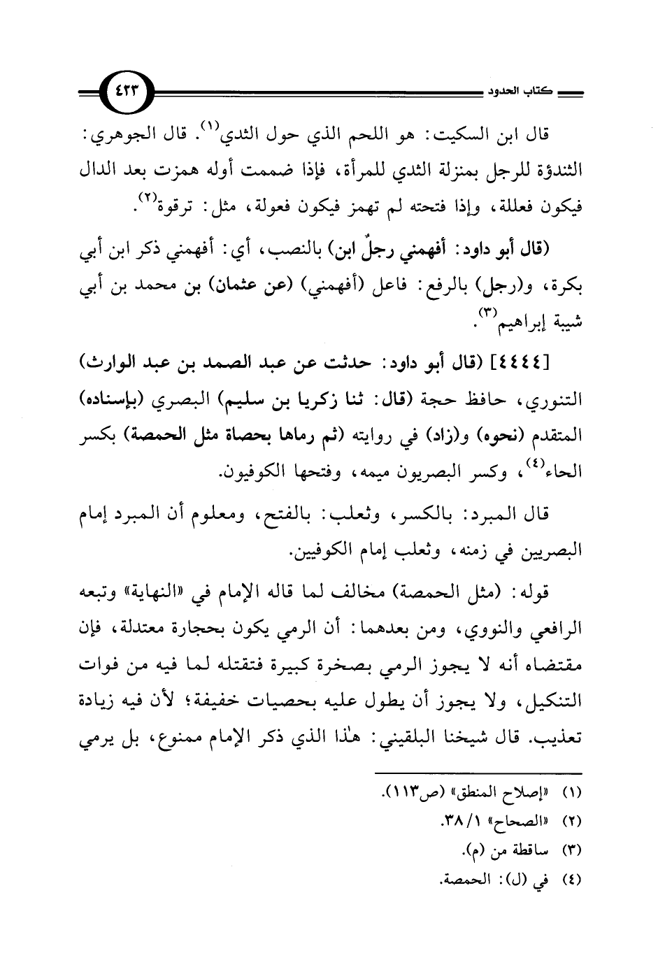 [4444] (قال أبو داود: حدثت عن عبد الصمد بن عبد الوارث) التنوري، حافظ حجة (قال: ثنا زكريا بن سليم) البصري (بإسناده) المتقدم (نحوه) و (زاد) في روايته (ثم رماها بحصاة مثل الحمصة) بكسر الحاء (¬4)، وكسر البصريون ميمه، وفتحها الكوفيون.