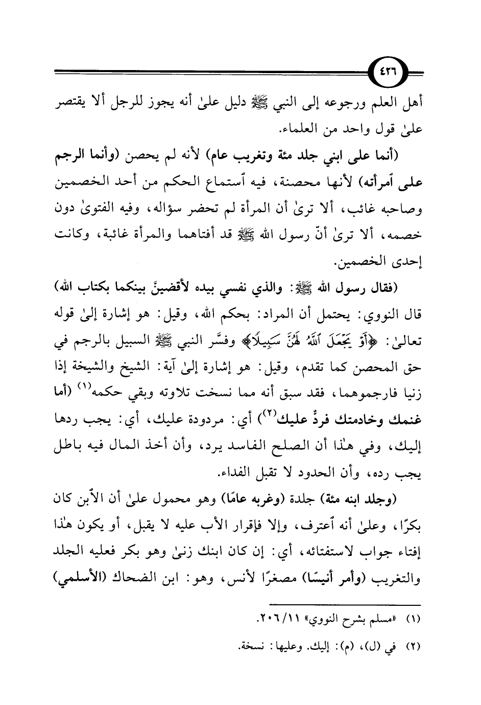 (فقال رسول اللَّه -صلى اللَّه عليه وسلم-: والذي نفسي بيده لأقضينَّ بينكما بكتاب اللَّه) قال النووي: يحتمل أن المراد: بحكم اللَّه، وقيل: هو إشارة إلى قوله تعالى: {أَوْ يَجْعَلَ اللَّهُ لَهُنَّ سَبِيلًا} وفسَّر النبي -صلى اللَّه عليه وسلم- السبيل بالرجم في حق المحصن كما تقدم، وقيل: هو إشارة إلى آية: الشيخ والشيخة إذا زنيا فارجموهما، فقد سبق أنه مما نسخت تلاوته وبقي حكمه (¬1) (أما غنمك وخادمتك فردّ عليك) (¬2) أي: مردودة عليك، أي: يجب ردها إليك، وفي هذا أن الصلح الفاسد يرد، وأن أخذ المال فيه باطل يجب رده، وأن الحدود لا تقبل الفداء.
