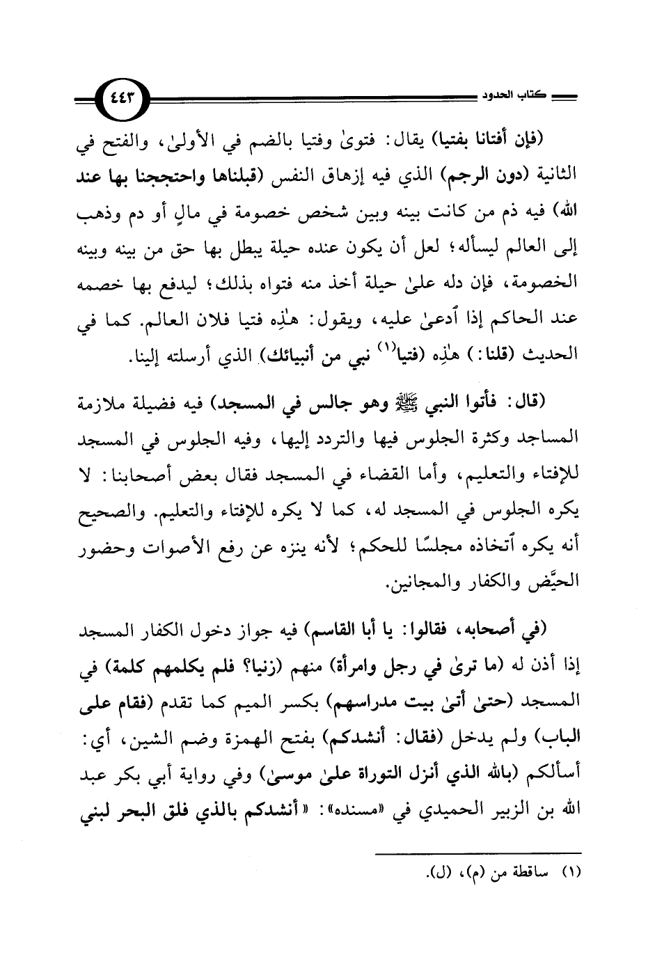 (فإن أفتانا بفتيا) يقال: فتوى وفتيا بالضم في الأولى، والفتح في الثانية (دون الرجم) الذي فيه إزهاق النفس (قبلناها واحتججنا بها عند اللَّه) فيه ذم من كانت بينه وبين شخص خصومة في مالٍ أو دم وذهب إلى العالم ليسأله؛ لعل أن يكون عنده حيلة يبطل بها حق من بينه وبينه الخصومة، فإن دله على حيلة أخذ منه فتواه بذلك؛ ليدفع بها خصمه عند الحاكم إذا ادعى عليه، ويقول: هذِه فتيا فلان العالم. كما في الحديث (قلنا: ) هذِه (فتيا (¬1) نبي من أنبيائك) الذي أرسلته إلينا.
