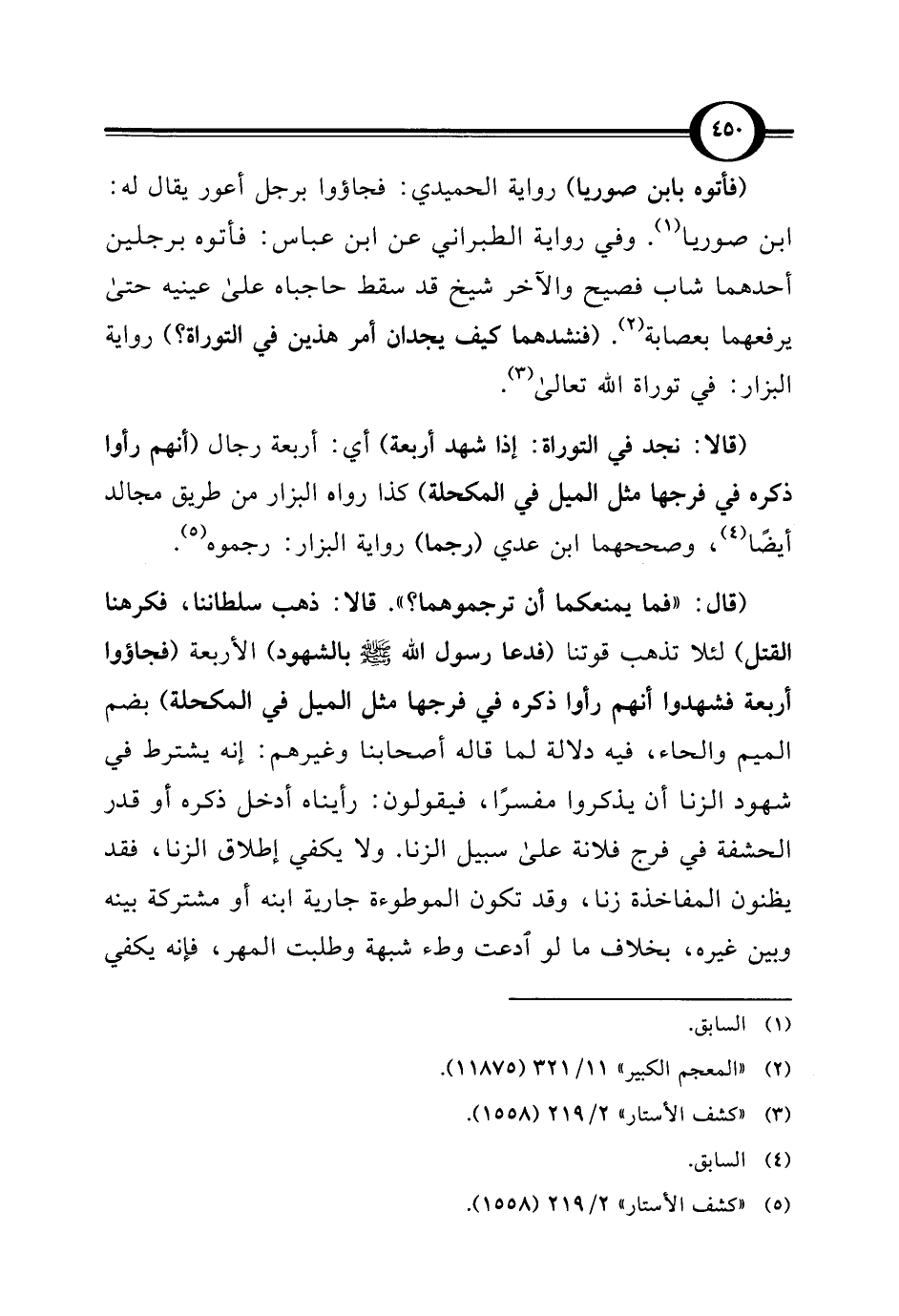 (فأتوه بابن صوريا) رواية الحميدي: فجاؤوا برجل أعور يقال له: ابن صوريا (¬1). وفي رواية الطبراني عن ابن عباس: فأتوه برجلين أحدهما شاب فصيح والآخر شيخ قد سقط حاجباه على عينيه حتى يرفعهما بعصابة (¬2). (فنشدهما كيف يجدان أمر هذين في التوراة؟ ) رواية البزار: في توراة اللَّه تعالى (¬3).