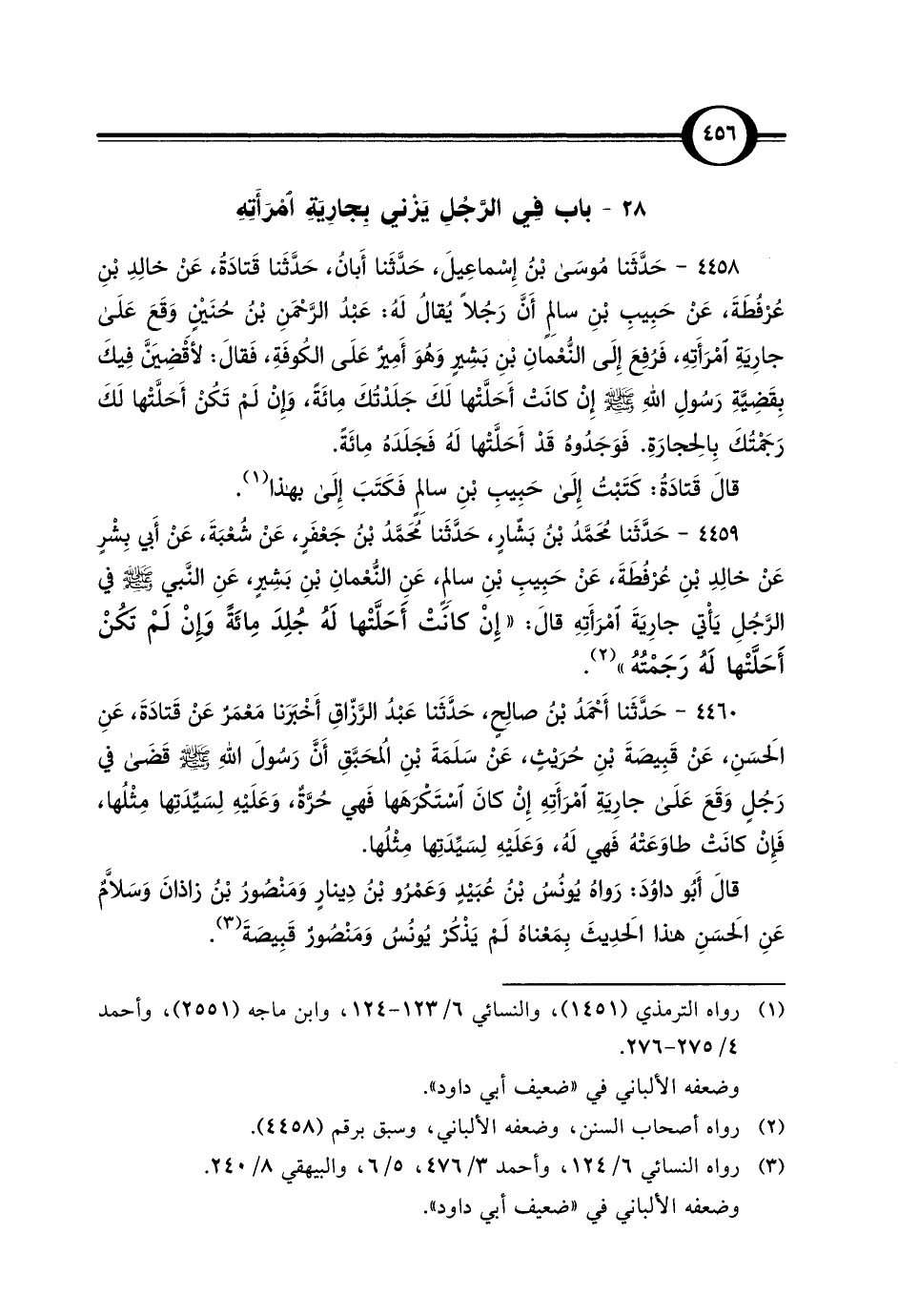 4458 - حَدَّثَنا مُوسَى بْنُ إِسْماعِيلَ، حَدَّثَنا أَبانُ، حَدَّثَنا قَتادَةُ، عَنْ خالِدِ بْنِ عُرْفُطَةَ، عَنْ حَبِيبِ بْنِ سالِمٍ أَنَّ رَجُلًا يُقال لَهُ: عَبْدُ الرَّحْمَنِ بْن حُنَيْنٍ وَقَعَ عَلَى جارِيَةِ امْرَأَتِهِ، فَرُفِعَ إِلَى النُّعْمانِ بْنِ بَشِيرٍ وَهُوَ أَمِيرٌ عَلَى الكُوفَةِ، فَقالَ: لأَقْضِيَنَّ فِيكَ بِقَضِيَّةِ رَسُولِ اللَّهِ -صلى اللَّه عليه وسلم- إِنْ كَانَتْ أَحَلَّتْها لَكَ جَلَدْتُكَ مِائَةً، وإِنْ لَمْ تَكنْ أَحَلَّتْها لَكَ رَجَمْتُكَ بِالحِجارَةِ. فَوَجَدُوهُ قَدْ أَحَلَّتْها لَهُ فَجَلَدَة مِائَةً.