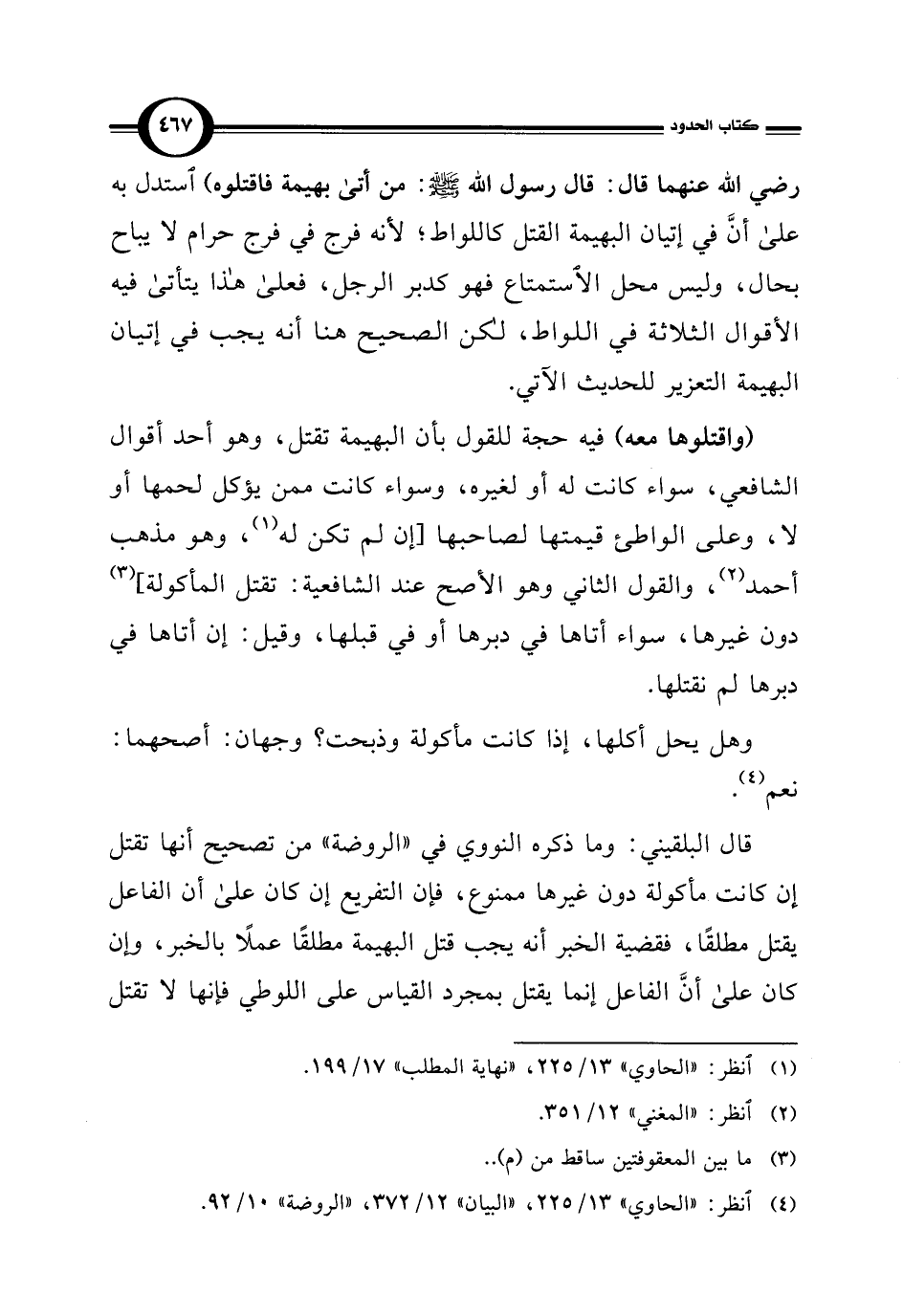 قال البلقيني: وما ذكره النووي في "الروضة" من تصحيح أنها تقتل إن كانت مأكولة دون غيرها ممنوع، فإن التفريع إن كان على أن الفاعل يقتل مطلقًا، فقضية الخبر أنه يجب قتل البهيمة مطلقًا عملًا بالخبر، وإن كان على أنَّ الفاعل إنما يقتل بمجرد القياس على اللوطي فإنها لا تقتل