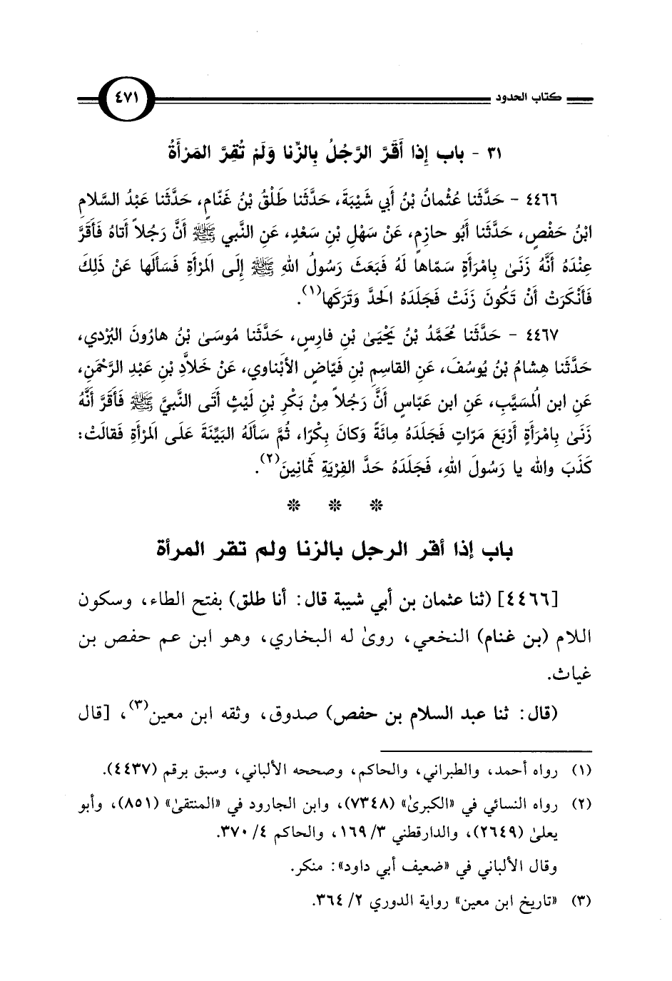 [4466] (ثنا عثمان بن أبي شيبة قال: أنا طلق) بفتح الطاء، وسكون اللام (بن غنام) النخعي، روى له البخاري، وهو ابن عم حفص بن غياث.