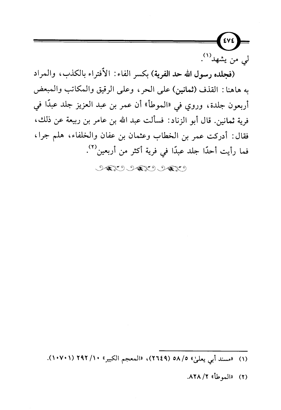 (فجلده رسول اللَّه حد الفرية) بكسر الفاء: الافتراء بالكذب، والمراد به هاهنا: القذف (ثمانين) على الحر، وعلى الرقيق والمكاتب والمبعض أربعون جلدة، وروي في "الموطأ" أن عمر بن عبد العزيز جلد عبدًا في فرية ثمانين. قال أبو الزناد: فسألت عبد اللَّه بن عامر بن ربيعة عن ذلك، فقال: أدركت عمر بن الخطاب وعثمان بن عفان والخلفاء، هلم جرا، فما رأيت أحدًا جلد عبدًا في فرية أكثر من أربعين (¬2).