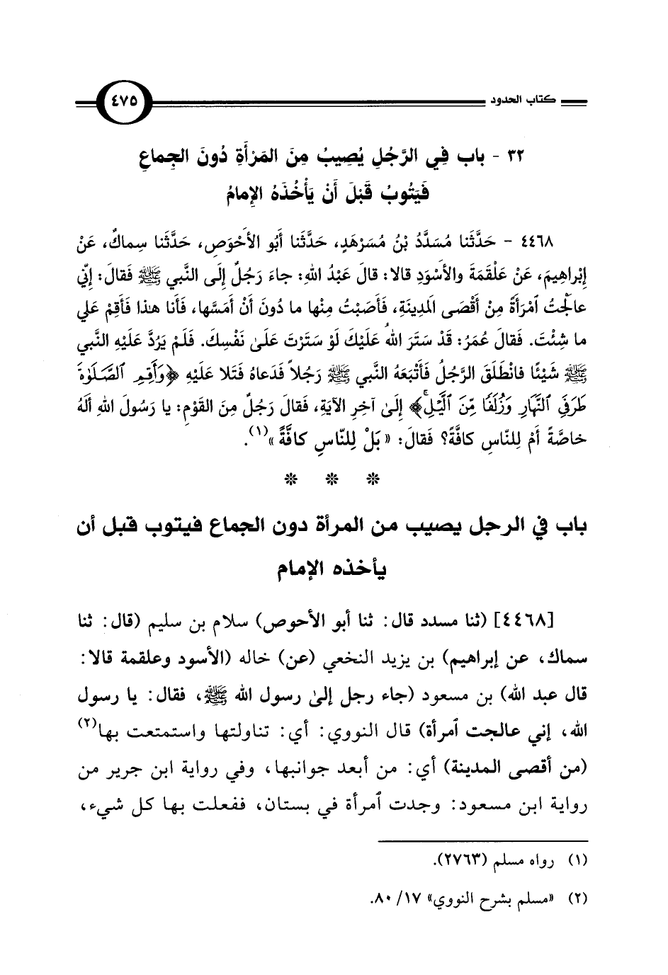 [4468] (ثنا مسدد قال: ثنا أبو الأحوص) سلام بن سليم (قال: ثنا سماك، عن إبراهيم) بن يزيد النخعي (عن) خاله (الأسود وعلقمة قالا: قال عبد اللَّه) بن مسعود (جاء رجل إلى رسول اللَّه -صلى اللَّه عليه وسلم-، فقال: يا رسول اللَّه، إني عالجت امرأة) قال النووي: أي: تناولتها واستمتعت بها (¬2) (من أقصى المدينة) أي: من أبعد جوانبها، وفي رواية ابن جرير من رواية ابن مسعود: وجدت امرأة في بستان، ففعلت بها كل شيء،