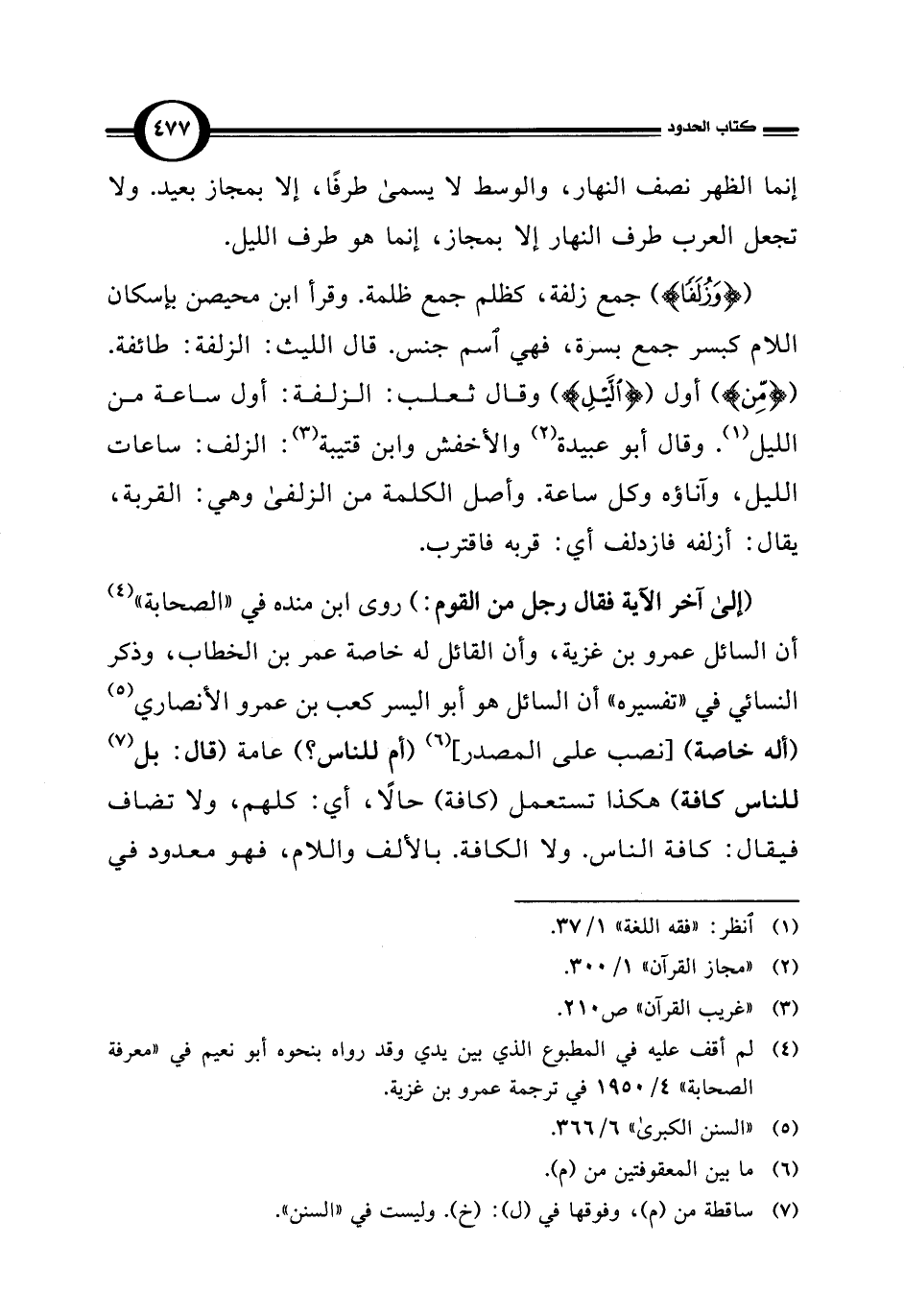 ({وَزُلَفًا}) جمع زلفة، كظلم جمع ظلمة. وقرأ ابن محيصن بإسكان اللام كبسر جمع بسرة، فهي اسم جنس. قال الليث: الزلفة: طائفة. ({مِنَ}) أول ({اللَّيْلِ}) وقال ثعلب: الزلفة: أول ساعة من الليل (¬1). وقال أبو عبيدة (¬2) والأخفش وابن قتيبة (¬3): الزلف: ساعات الليل، وآناؤه وكل ساعة. وأصل الكلمة من الزلفى وهي: القربة، يقال: أزلفه فازدلف أي: قربه فاقترب.