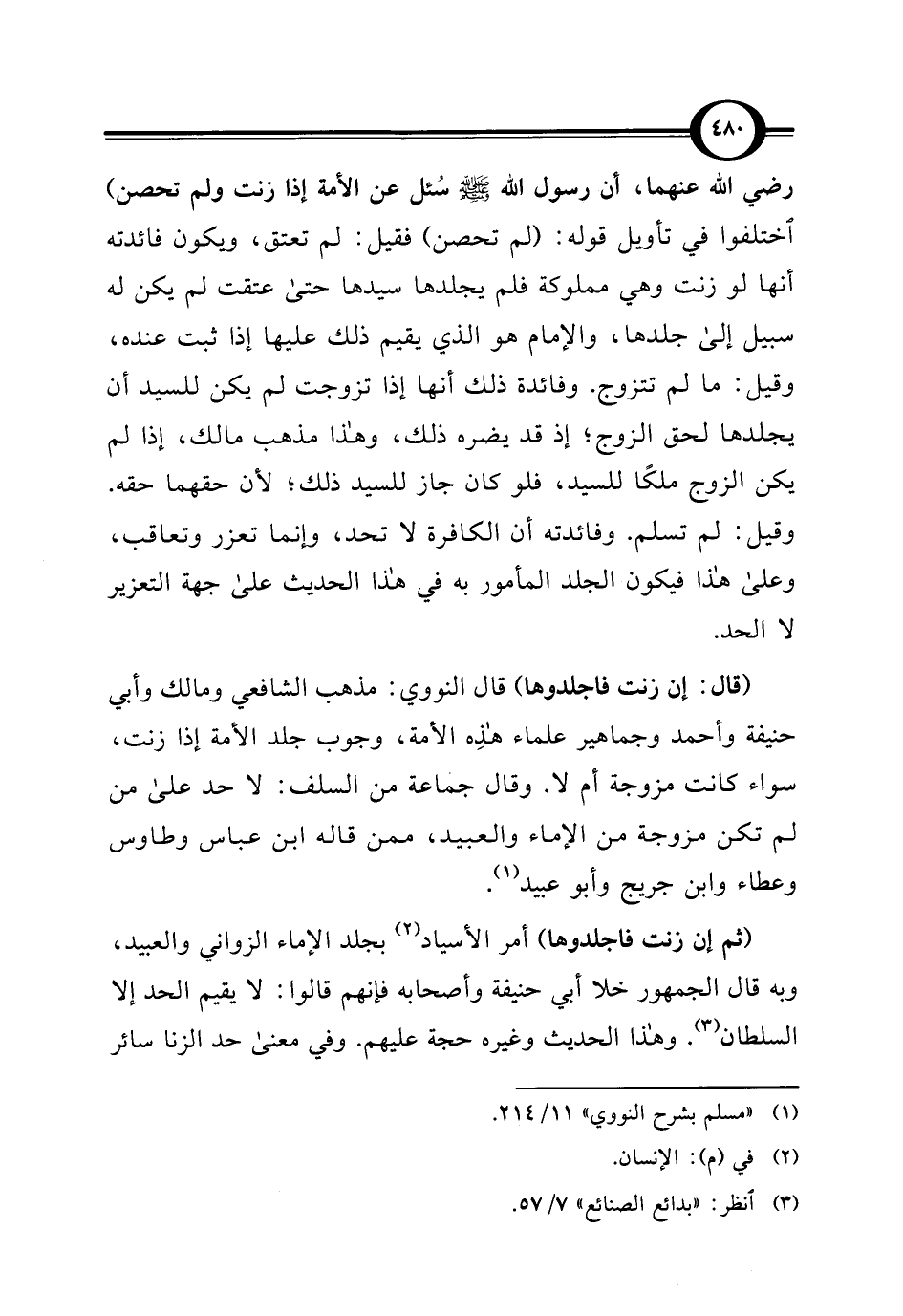 رضي اللَّه عنهما، أن رسول اللَّه -صلى اللَّه عليه وسلم- سُئل عن الأمة إذا زنت ولم تحصن) اختلفوا في تأويل قوله: (لم تحصن) فقيل: لم تعتق، ويكون فائدته أنها لو زنت وهي مملوكة فلم يجلدها سيدها حتى عتقت لم يكن له سبيل إلى جلدها، والإمام هو الذي يقيم ذلك عليها إذا ثبت عنده، وقيل: ما لم تتزوج. وفائدة ذلك أنها إذا تزوجت لم يكن للسيد أن يجلدها لحق الزوج؛ إذ قد يضره ذلك، وهذا مذهب مالك، إذا لم يكن الزوج ملكًا للسيد، فلو كان جاز للسيد ذلك؛ لأن حقهما حقه. وقيل: لم تسلم. وفائدته أن الكافرة لا تحد، وإنما تعزر وتعاقب، وعلى هذا فيكون الجلد المأمور به في هذا الحديث على جهة التعزير لا الحد.