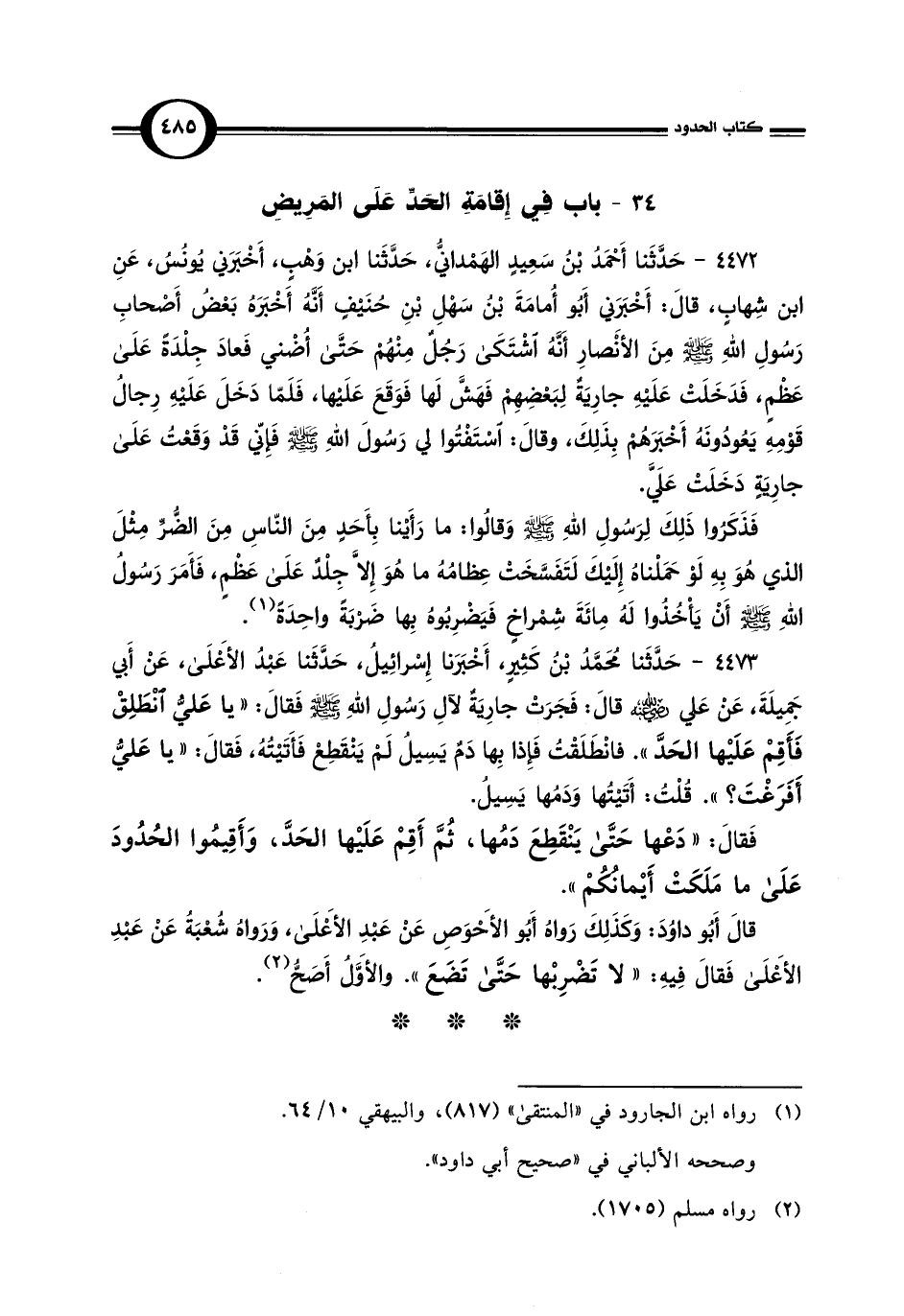 4472 - حَدَّثَنا أَحْمَدُ بْن سَعِيدٍ الهَمْدانيُّ، حَدَّثَنا ابن وَهْبٍ، أَخْبَرَني يُونُسُ، عَنِ ابن شِهابٍ، قالَ: أَخْبَرَني أَبُو أُمامَةَ بْنُ سَهْلٍ بْنِ حُنَيْفٍ أَنَّهُ أَخْبَرَهُ بَعْضُ أَصْحابِ رَسُولِ اللَّهِ -صلى اللَّه عليه وسلم- مِنَ الأَنْصارِ أَنَّهُ اشْتَكَى رَجُلٌ مِنْهُمْ حَتَّى أُضْني فَعادَ جِلْدَةً عَلَى عَظْمٍ، فَدَخَلَتْ عَلَيْهِ جارِيَةٌ لِبَعْضِهِمْ فَهَشَّ لَها فَوَقَعَ عَلَيْها، فَلَمّا دَخَلَ عَلَيْهِ رِجالُ قَوْمِهِ يَعُودُونَهُ أَخْبَرَهُمْ بِذَلِكَ، وقالَ: اسْتَفْتُوا لي رَسُولَ اللَّهِ -صلى اللَّه عليه وسلم- فإِنّي قَدْ وَقَعْتُ عَلَى جارِيَةٍ دَخَلَتْ عَلَيَّ.