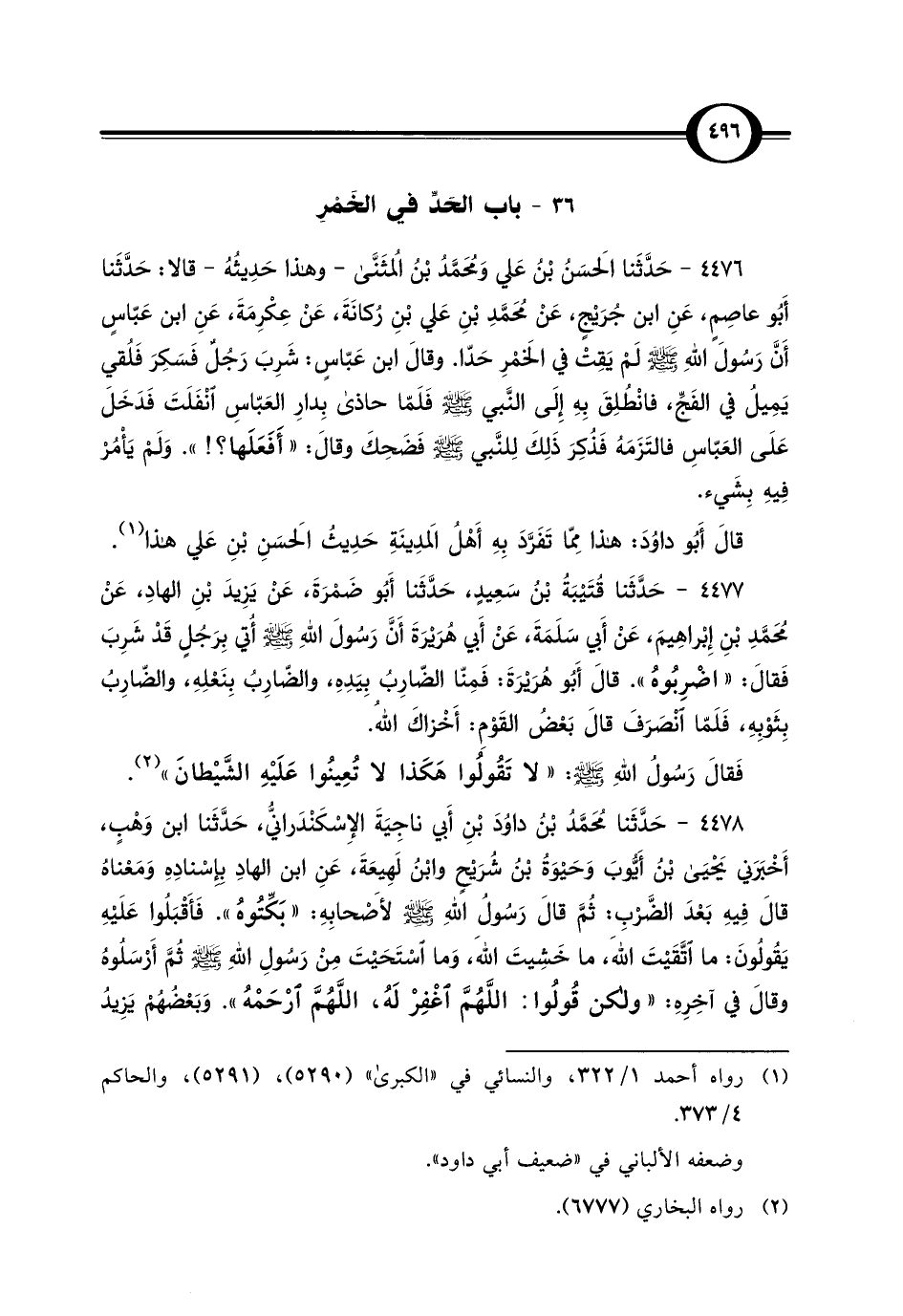 4476 - حَدَّثَنا الحَسَنُ بْنُ عَلي وَمُحَمَّدُ بْنُ المُثَنَّى -وهذا حَدِيثُهُ- قالا: حَدَّثَنا أَبُو عاصِمٍ، عَنِ ابن جُرَيْجٍ، عَنْ مُحَمَّدِ بْنِ عَلي بْنِ رُكانَةَ، عَنْ عِكْرِمَةَ، عَنِ ابن عَبّاسٍ أَنَّ رَسُولَ اللَّهِ -صلى اللَّه عليه وسلم- لَمْ يَقِتْ في الخَمْرِ حَدّا. وقالَ ابن عَبّاسٍ: شَرِبَ رَجُلٌ فَسَكِرَ فَلُقي يَمِيل في الفَجِّ، فانْطُلِقَ بِهِ إِلَى النَّبي -صلى اللَّه عليه وسلم- فَلَمّا حاذى بِدارِ العَبّاسِ انْفَلَتَ فَدَخَلَ عَلَى العَبّاسِ فالتَزَمَهُ فَذكِرَ ذَلِكَ لِلنَّبي -صلى اللَّه عليه وسلم- فَضَحِكَ وقالَ: " أَفَعَلَها؟ ! ". وَلَمْ يَأْمُرْ فِيهِ بِشَيء.