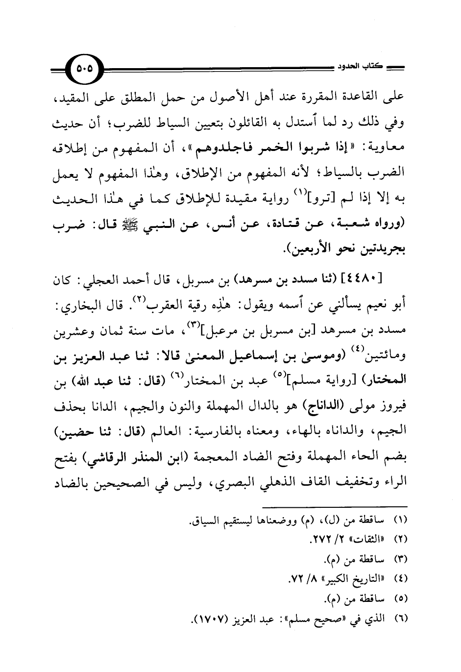 [4480] (ثنا مسدد بن مسرهد) بن مسربل، قال أحمد العجلي: كان أبو نعيم يسألني عن اسمه ويقول: هذِه رقية العقرب (¬2). قال البخاري: مسدد بن مسرهد [بن مسربل بن مرعبل] (¬3)، مات سنة ثمان وعشرين ومائتين (¬4) (وموسى بن إسماعيل المعنى قالا: ثنا عبد العزيز بن المختار) [رواية مسلم] (¬5) عبد بن المختار (¬6) (قال: ثنا عبد اللَّه) بن فيروز مولى (الداناج) هو بالدال المهملة والنون والجيم، الدانا بحذف الجيم، والداناه بالهاء، ومعناه بالفارسية: العالم (قال: ثنا حضين) بضم الحاء المهملة وفتح الضاد المعجمة (ابن المنذر الرقاشي) بفتح الراء وتخفيف القاف الذهلي البصري، وليس في الصحيحين بالضاد