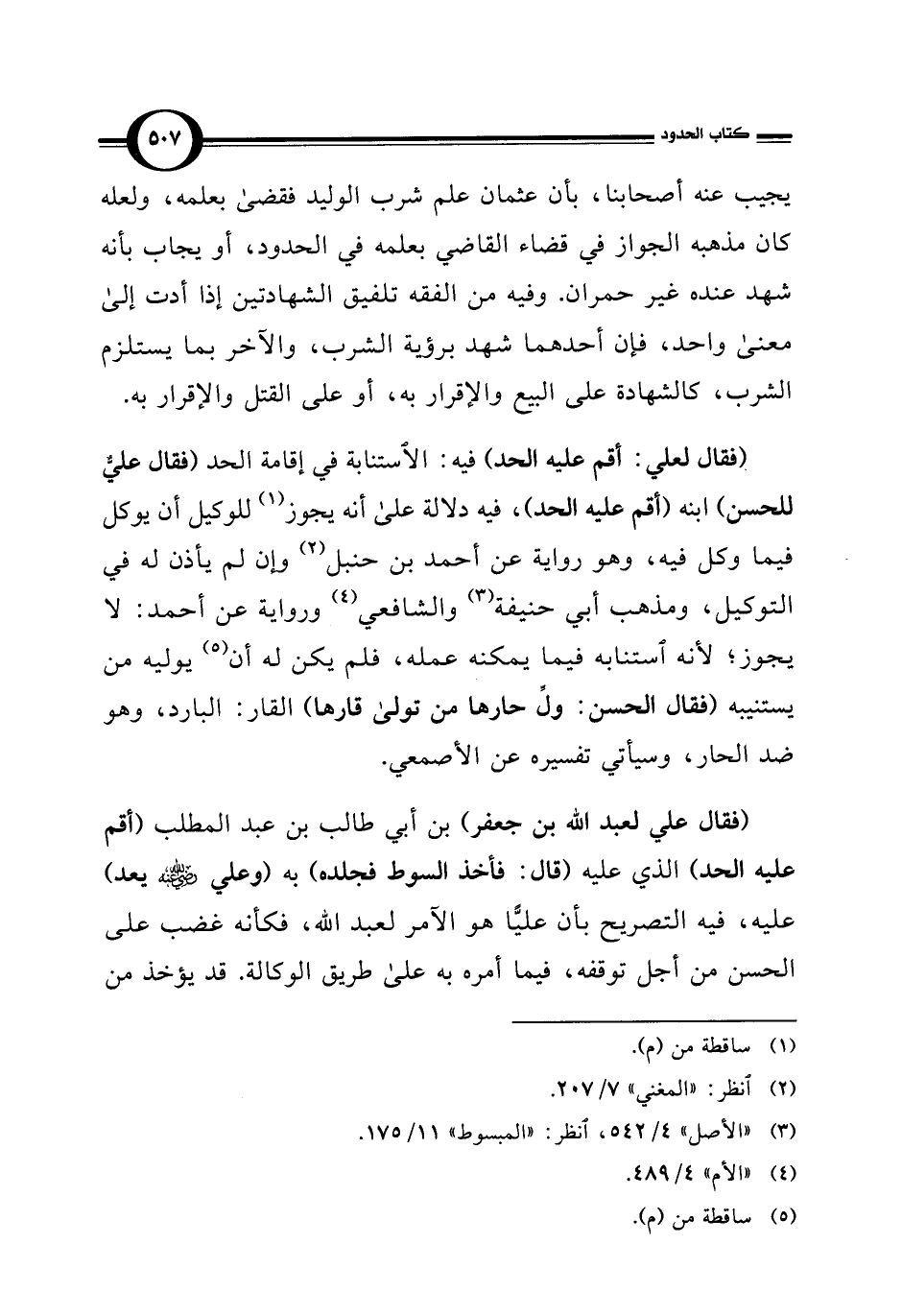 (فقال لعلي: أقم عليه الحد) فيه: الاستنابة في إقامة الحد (فقال عليٌّ للحسن) ابنه (أقم عليه الحد)، فيه دلالة على أنه يجوز (¬1) للوكيل أن يوكل فيما وكل فيه، وهو رواية عن أحمد بن حنبل (¬2) وإن لم يأذن له في التوكيل، ومذهب أبي حنيفة (¬3) والشافعي (¬4) ورواية عن أحمد: لا يجوز؛ لأنه استنابه فيما يمكنه عمله، فلم يكن له أن (¬5) يوليه من يستنيبه (فقال الحسن: ولِّ حارها من تولى قارها) القار: البارد، وهو ضد الحار، وسيأتي تفسيره عن الأصمعي.