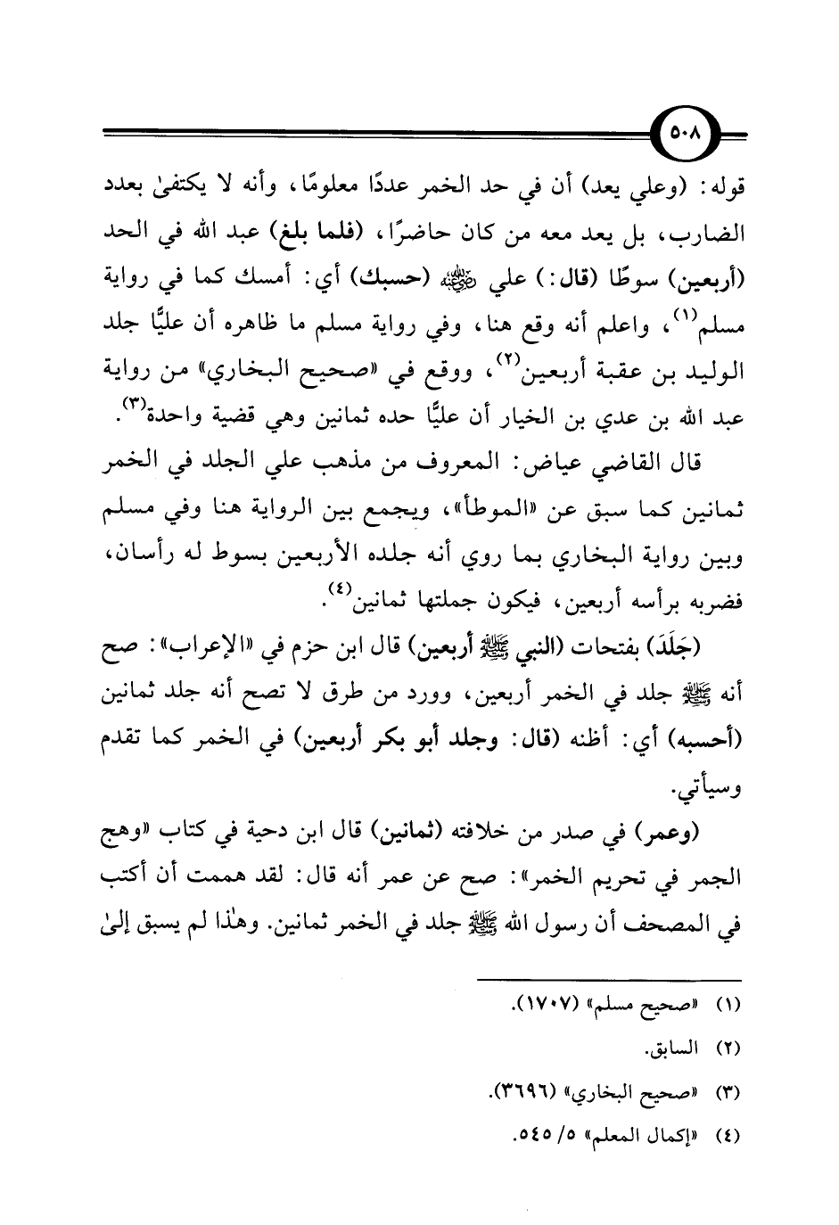 قال القاضي عياض: المعروف من مذهب علي الجلد في الخمر ثمانين كما سبق عن "الموطأ"، ويجمع بين الرواية هنا وفي مسلم وبين رواية البخاري بما روي أنه جلده الأربعين بسوط له رأسان، فضربه برأسه أربعين، فيكون جملتها ثمانين (¬4).