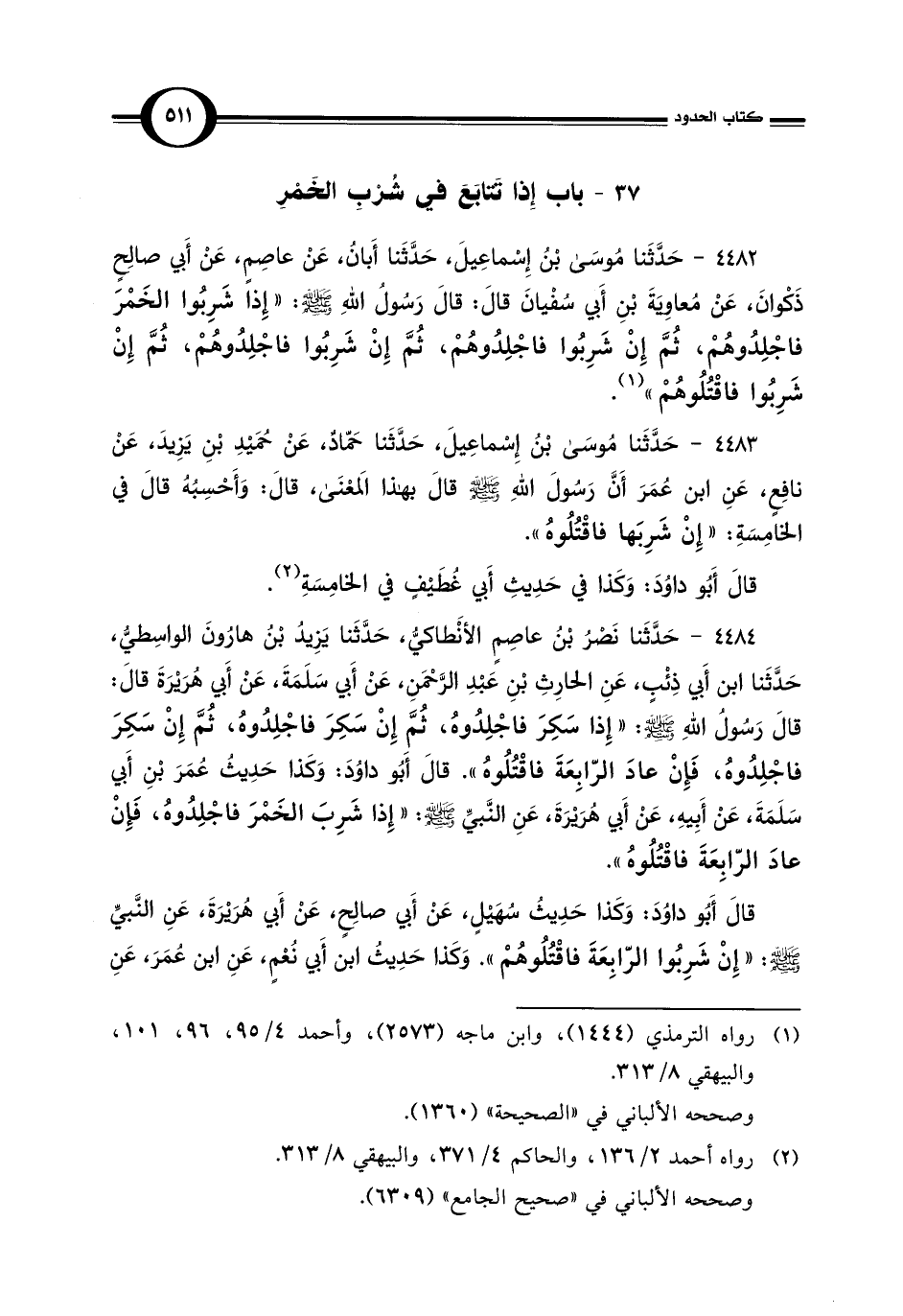 4484 - حَدَّثَنا نَصْرُ بْن عاصِمٍ الأَنْطاكيُّ، حَدَّثَنا يَزِيدُ بْن هارُونَ الواسِطيُّ، حَدَّثَنا ابن أَبي ذِئْبٍ، عَنِ الحارِثِ بْنِ عَبْدِ الرَّحْمَنِ، عَنْ أَبي سَلَمَةَ، عَنْ أَبي هُرَيْرَةَ قالَ: قالَ رَسُولُ اللَّهِ -صلى اللَّه عليه وسلم-: "إِذا سَكِرَ فاجْلِدُوهُ، ثُمَّ إِنْ سَكِرَ فاجْلِدُوهُ، ثُمَّ إِنْ سَكِرَ فاجْلِدُوهُ، فَإِنْ عادَ الرّابِعَةَ فاقْتُلُوهُ". قالَ أَبُو داوُدَ: وَكَذا حَدِيثُ عُمَرَ بْنِ أَبي سَلَمَةَ، عَنْ أَبِيهِ، عَنْ أَبي هُرَيْرَةَ، عَنِ النَّبيِّ -صلى اللَّه عليه وسلم-: "إِذا شَرِبَ الخَمْرَ فاجْلِدُوهُ، فَاِنْ عادَ الرّابِعَةَ فاقْتُلُوهُ".